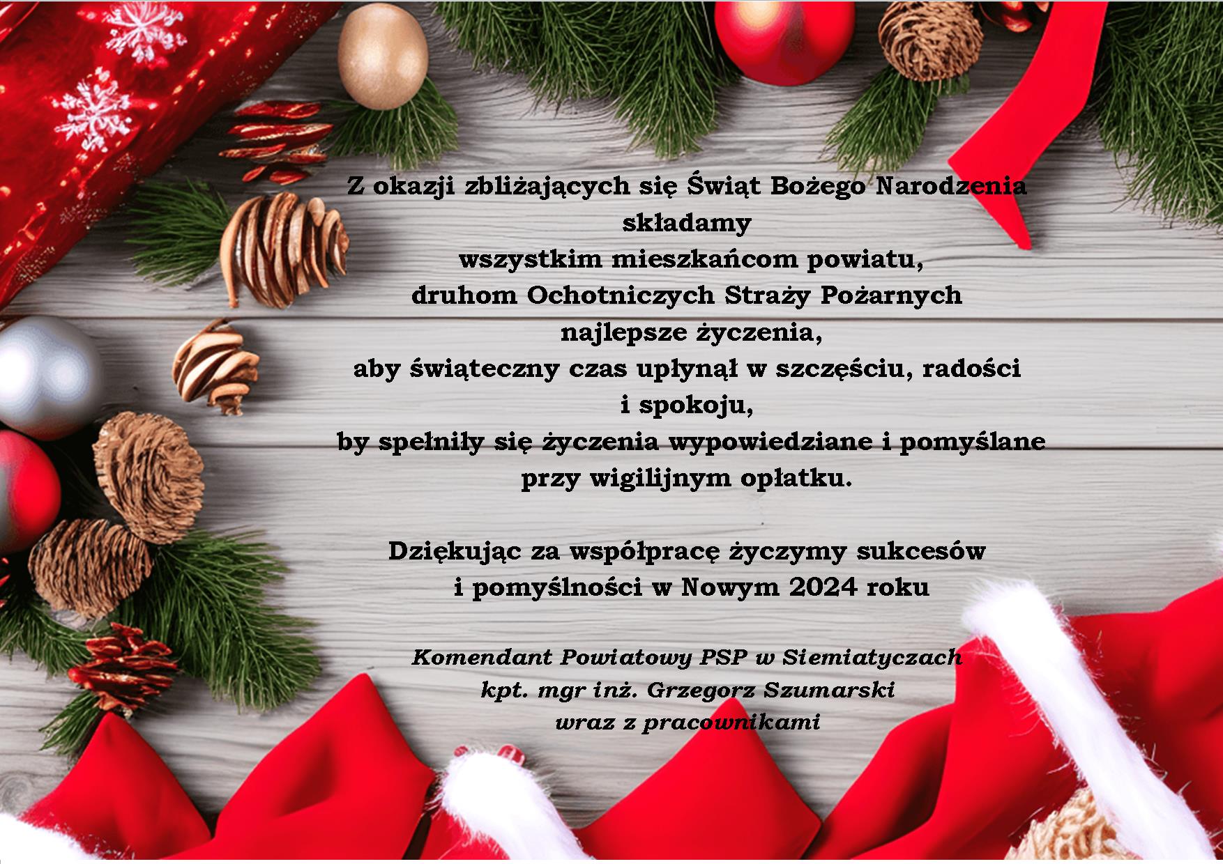 Z okazji zbliżających się Świąt Bożego Narodzenia składamy wszystkim mieszkańcom powistu siemiatyckiego oraz druhom Ochotniczych Straży Pożarnych najlepsze życzenia aby świąteczny czas upłynął w szczęściu, radości i spokoju, by spełniły się życzenia wypowiedziane i pomyślane przy wigilijnym opłatku. Dziękując za współpracę życzymy sukcesów i pomyślności w Nowym Roku 2024.