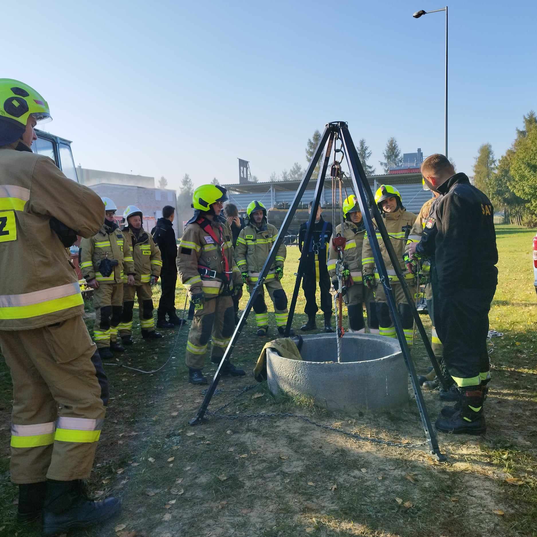 Drugi aspekt ćwiczeń polegał na ewakuacji osoby poszkodowanej ze studni za pomocą trójnogu ratowniczego. Strażacy szlifowali techniki ewakuacyjne z wykorzystaniem sprzętu alpinistycznego.