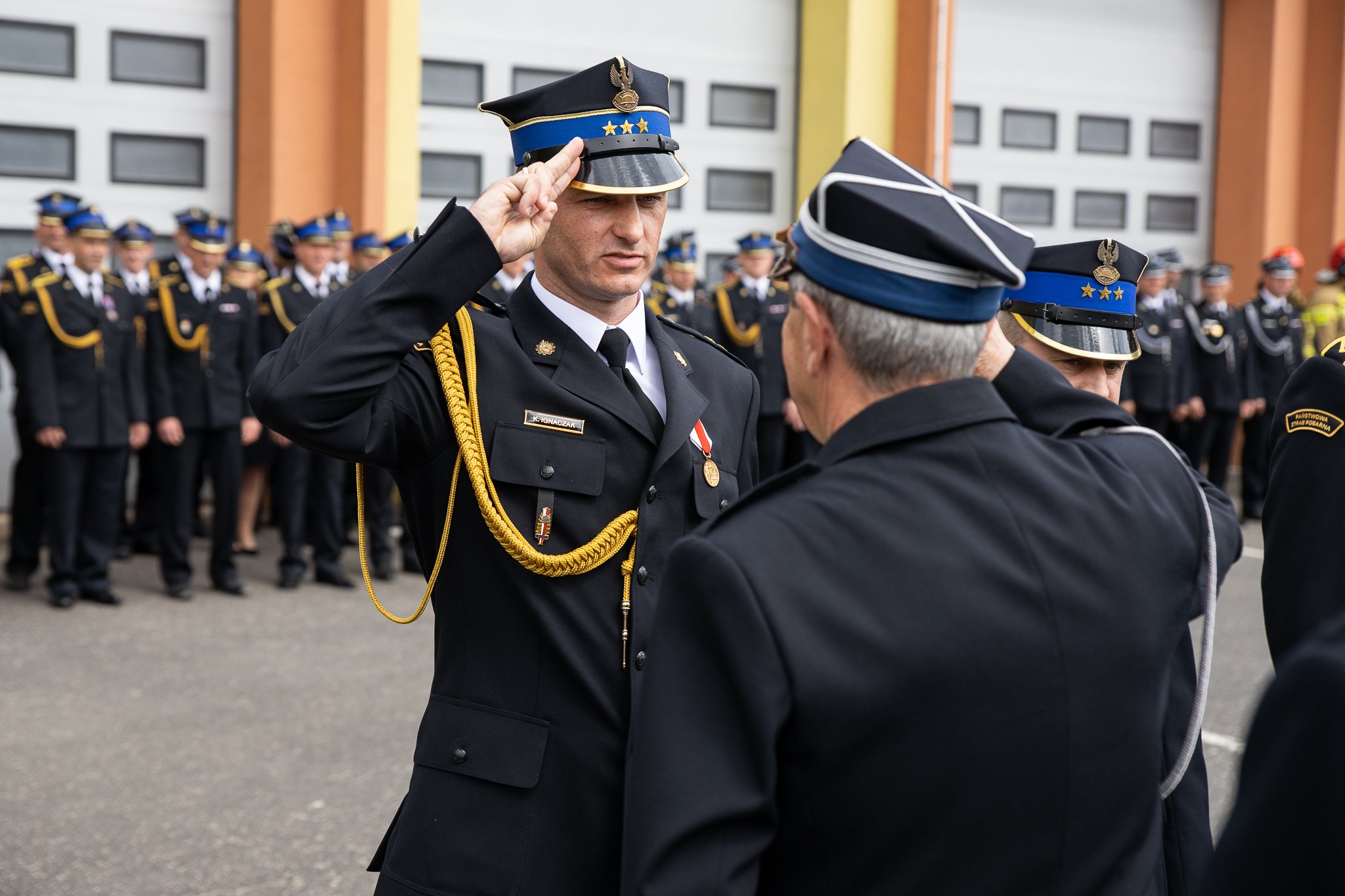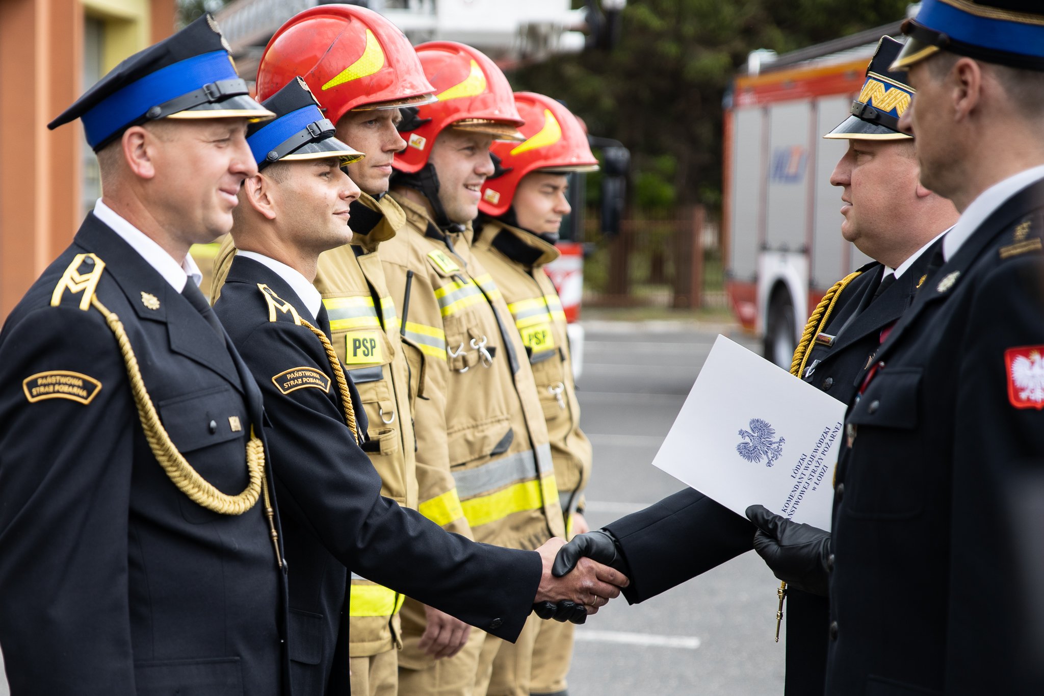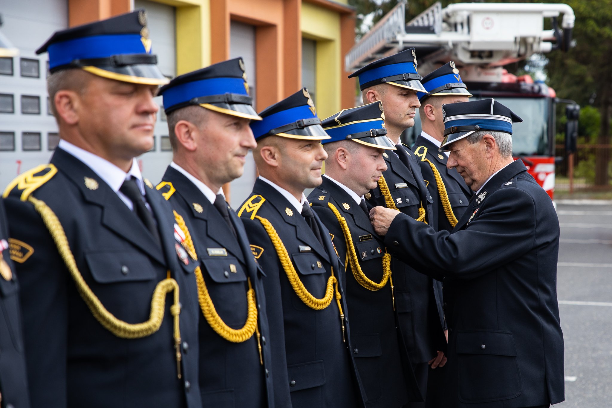 Podczas uroczystości dokonano wręczenia odznaczeń i aktów nominacyjnych na wyższe stopnie służbowe dla funkcjonariuszy i druhów strażaków powiatu sieradzkiego: