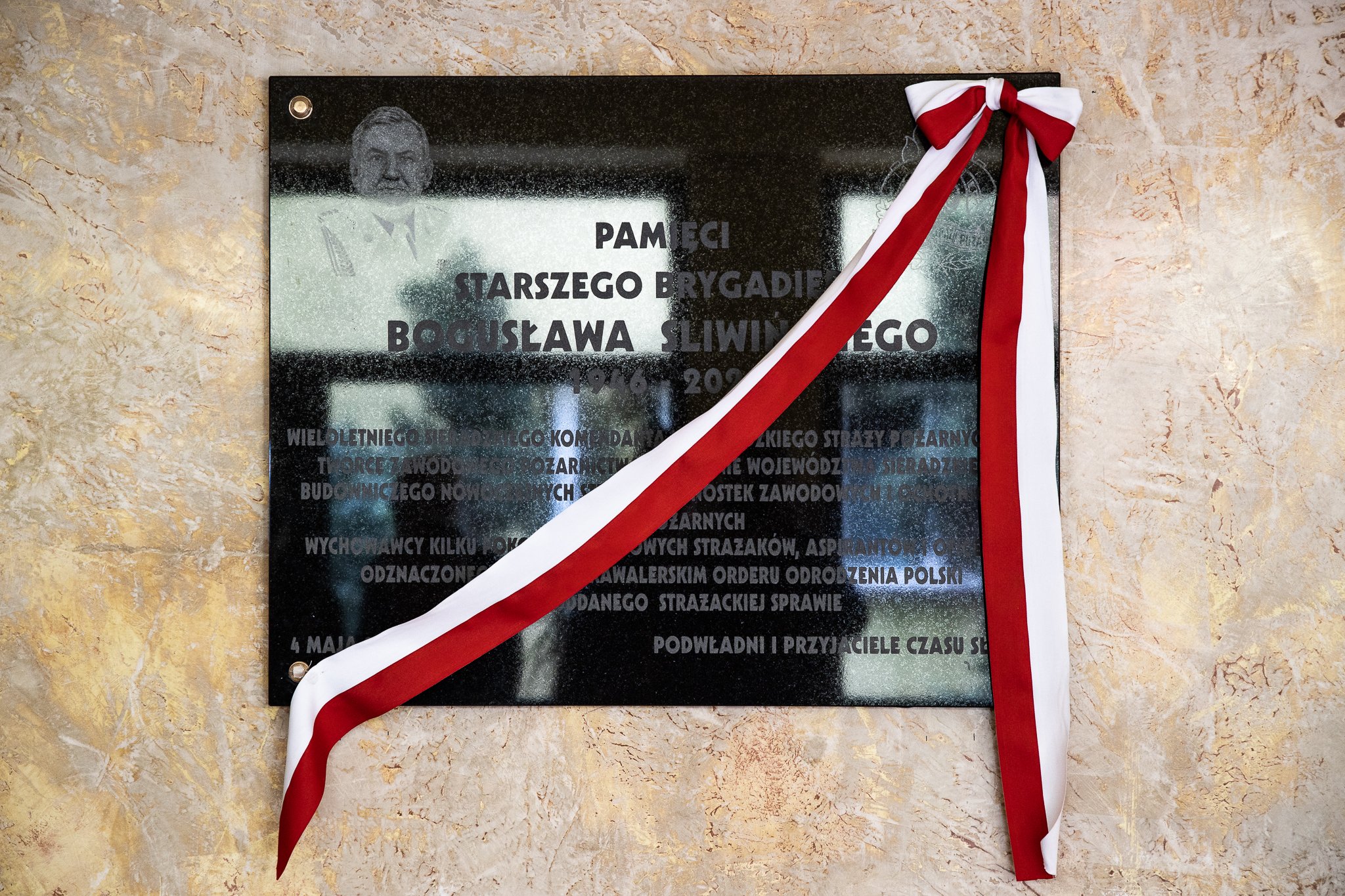 Ostatnim punktem uroczystości było odsłonięcie tablicy pamiątkowej św. pamięci st. bryg. Bogusława Śliwińskiego - wieloletniego komendanta wojewódzkiego.