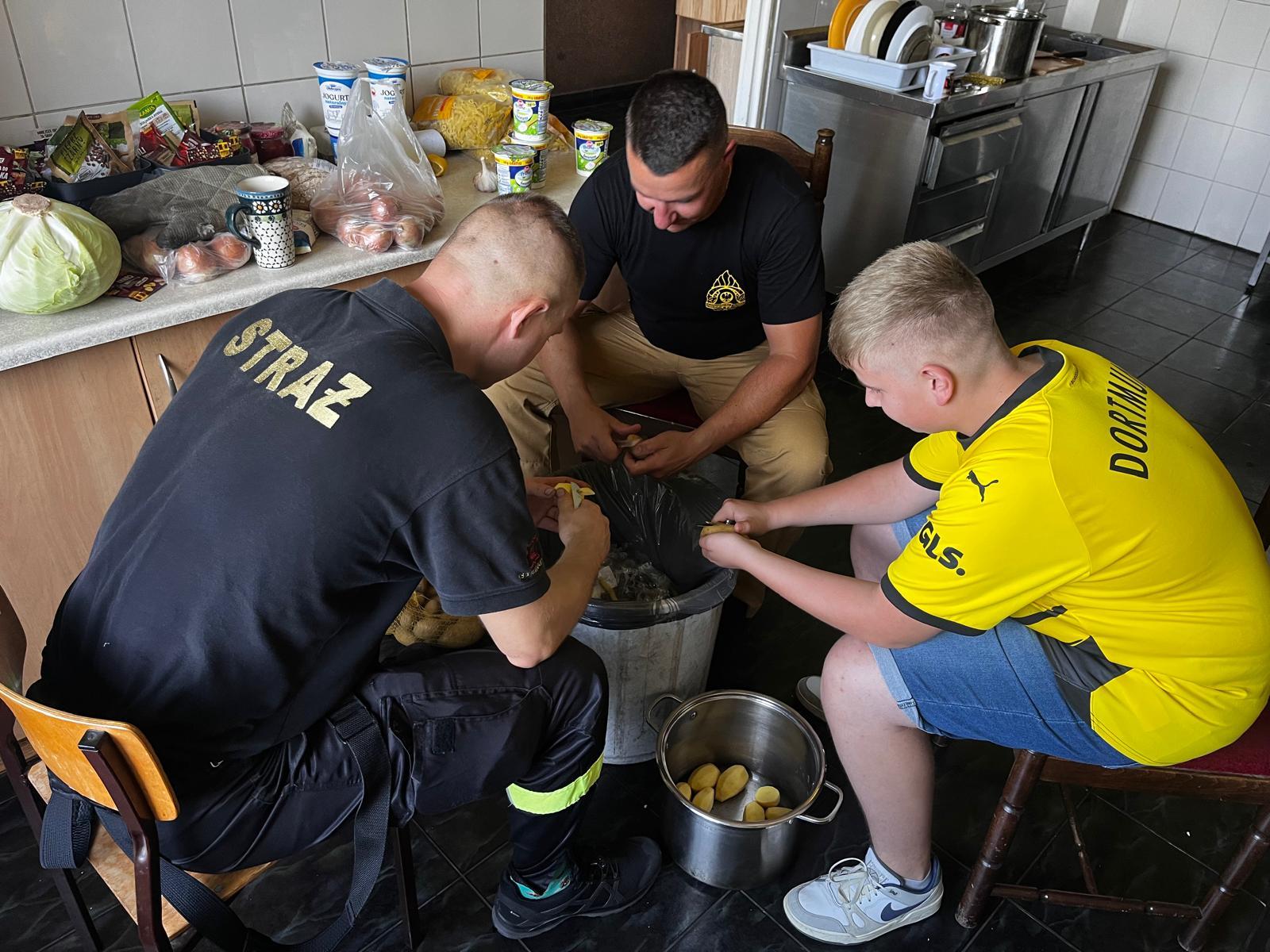 Oczywiście nie obyło się bez zadań „niezbędnych” czyli udziału w przygotowaniu zmianowego obiadu. Kacper dzielnie ostrugał wydzieloną część ziemniaków – poradził.