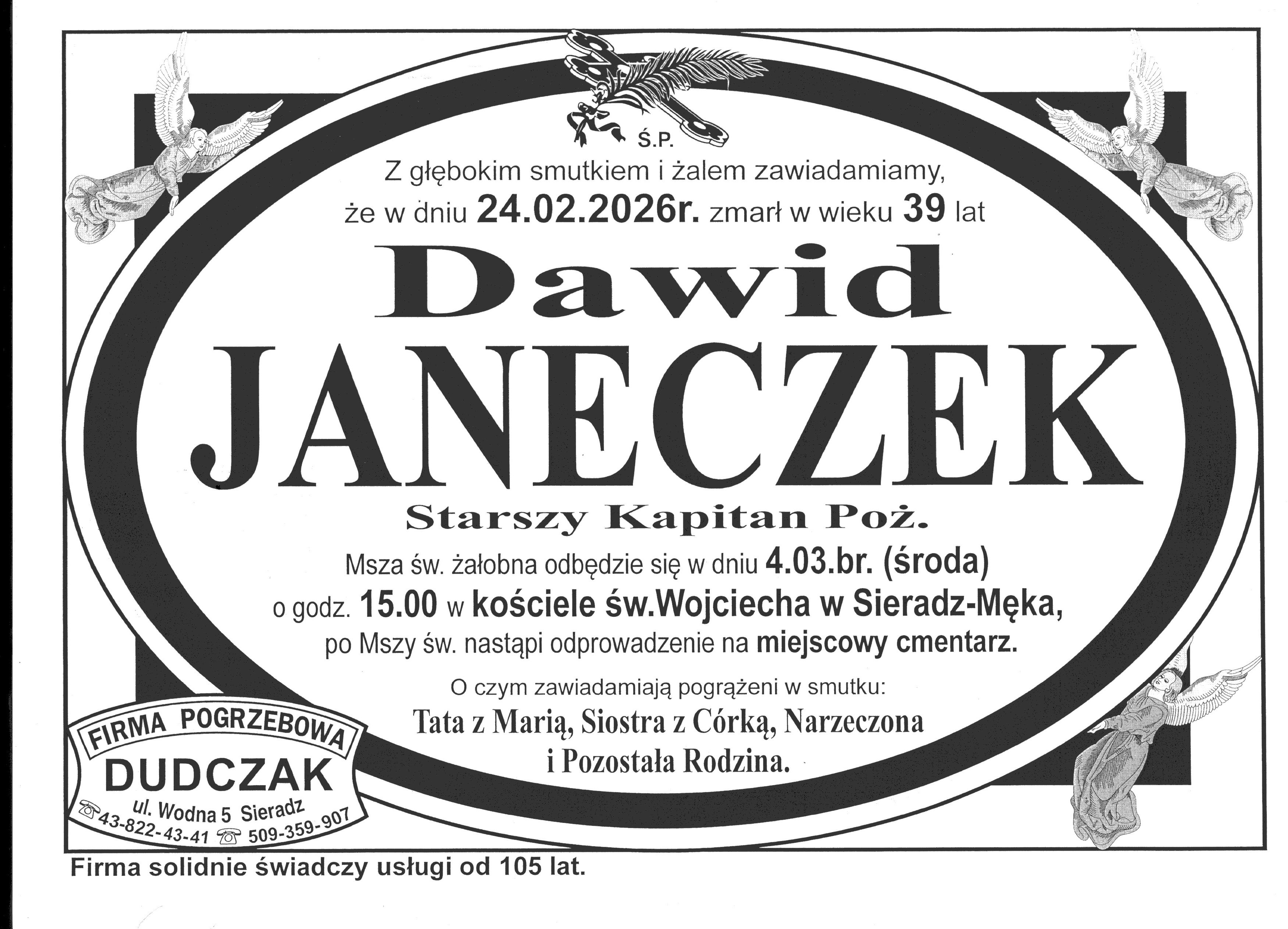 Komenda Powiatowa PSP w Sieradzu informuję, że uroczystości pogrzebowe funkcjonariusza KP PSP w Sieradzu st. kpt. Dawida Janeczka odbędą się w dniu 4 marca 2026 r. o godzinie 15:00 w kościele św. Wojciecha w Sieradz-Męka.