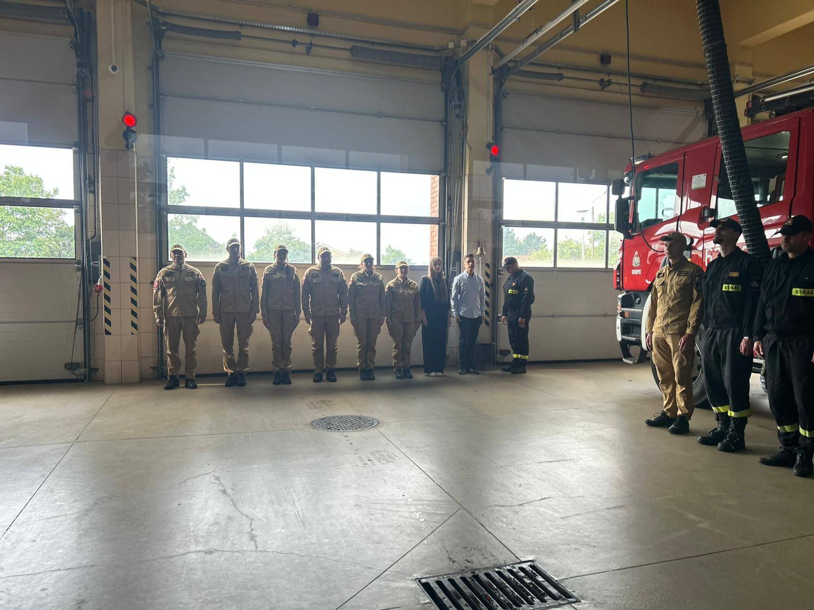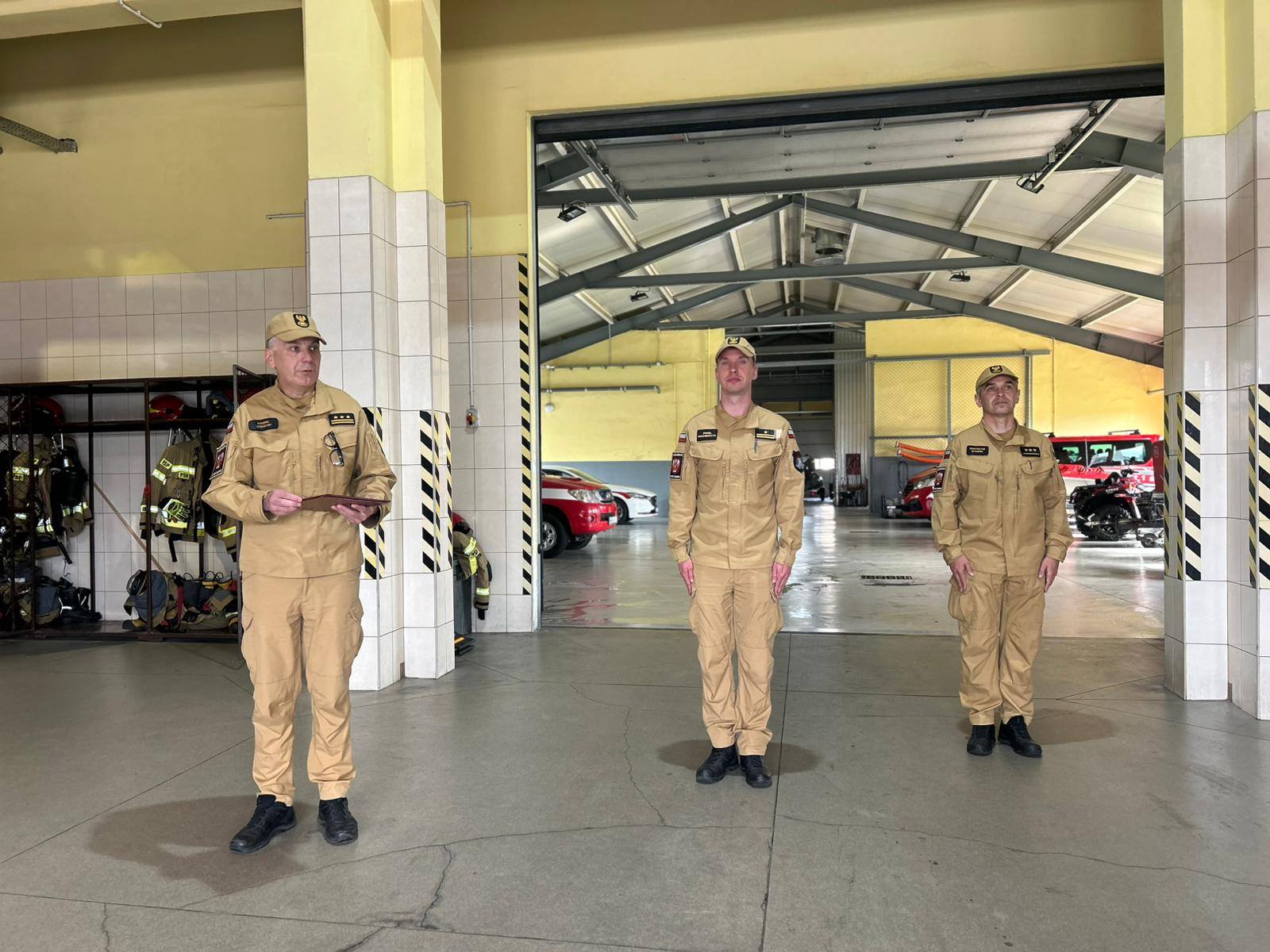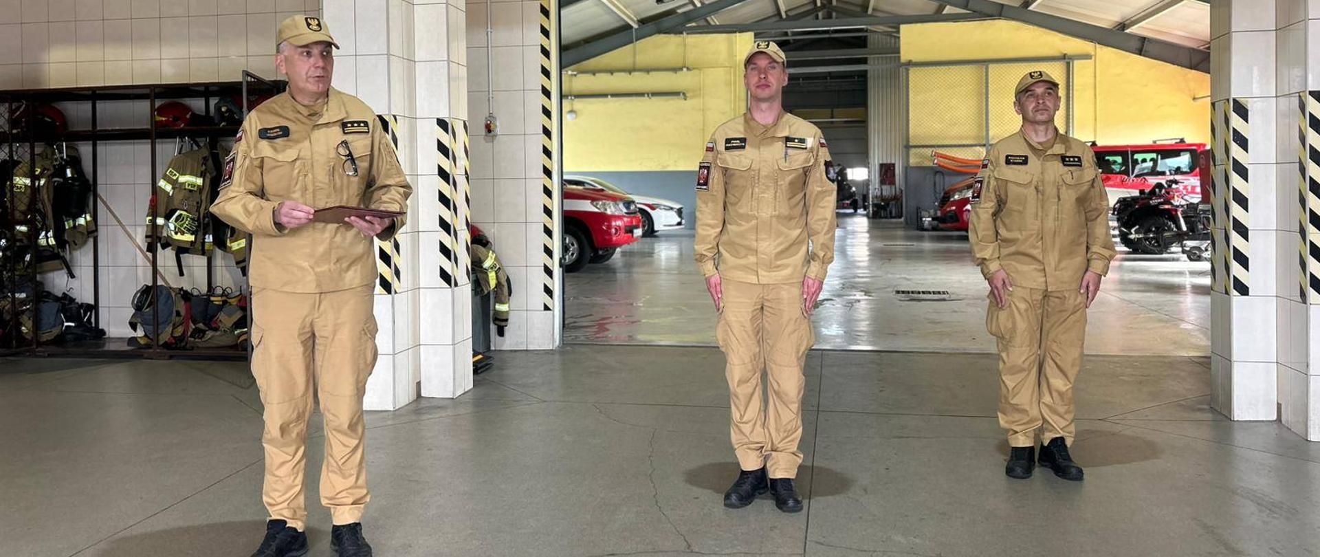 Podczas zmiany służby 2 czerwca 2025 r. w obecności strażaków i pracownika cywilnego Komendant Powiatowy PSP w Sierpcu st. bryg. Paweł Sekulski wręczył:
