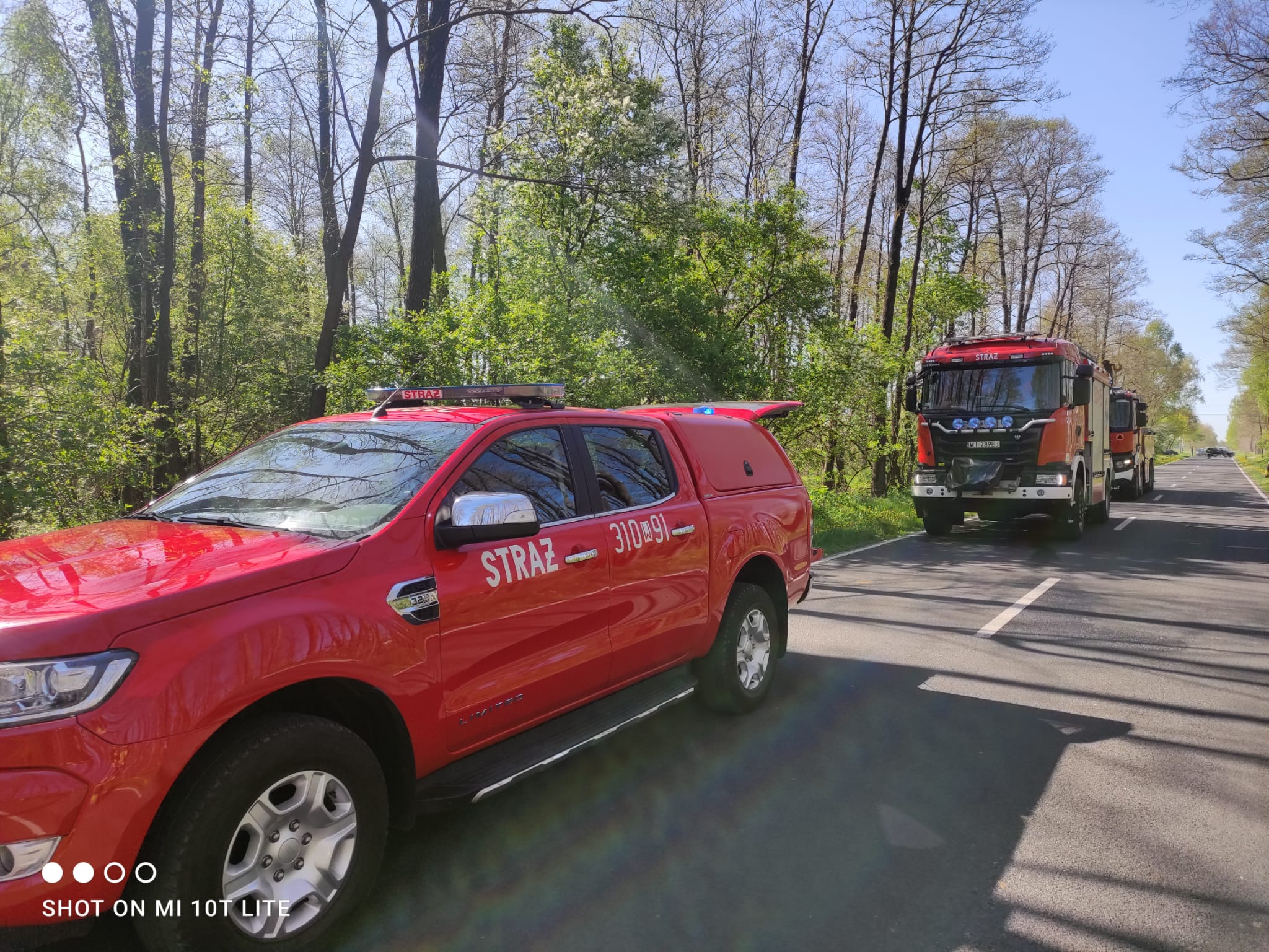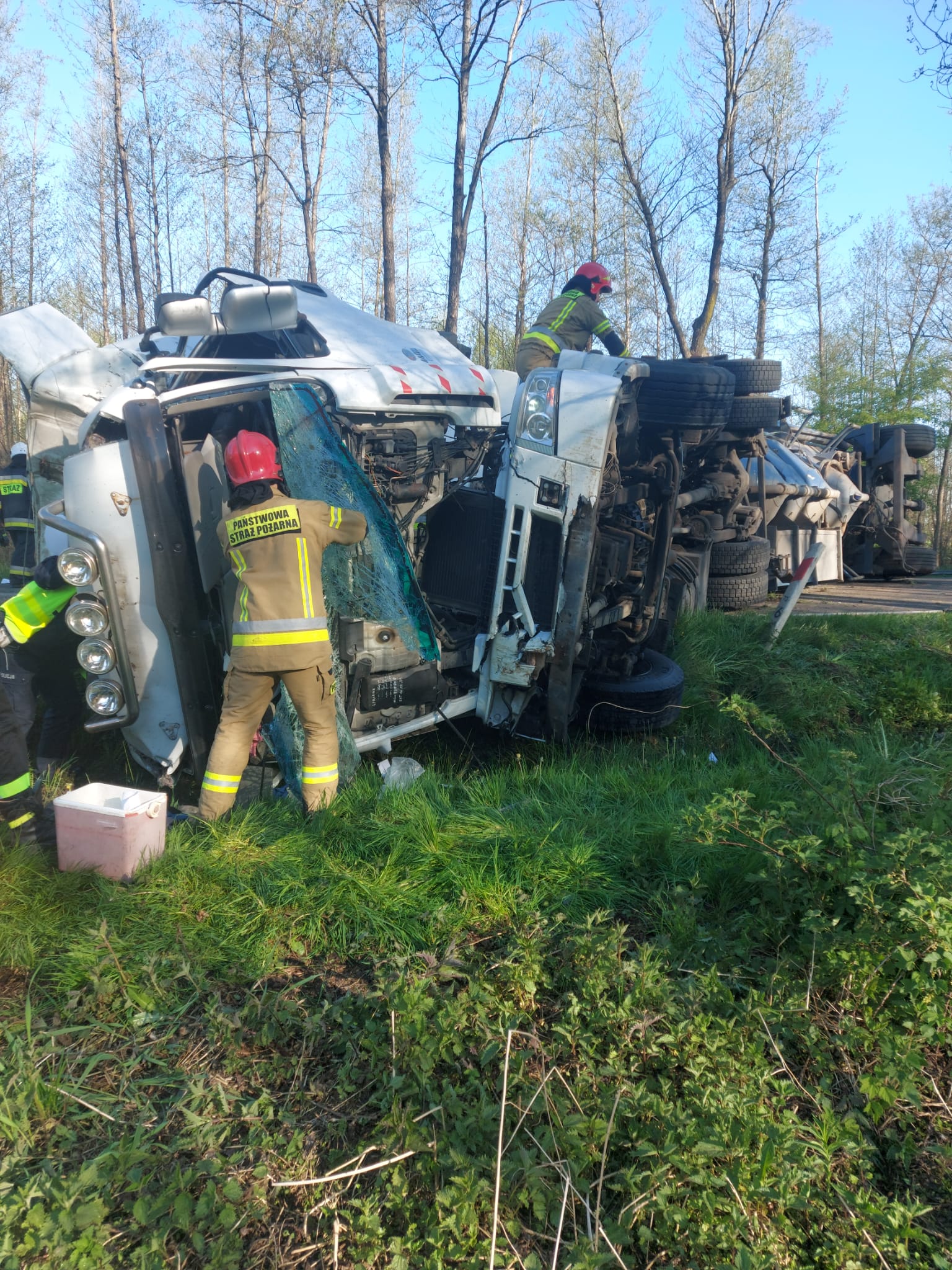 Do pierwszego zdarzenia tego dnia strażacy zostali wezwani o godz. 705, gdzie na drodze wojewódzkiej nr 541 doszło do wypadku ciągnika siodłowego z naczepą wypełnioną sypką paszą. Samochód leżał na boku w poprzek drogi, całkowicie tarasując przejazd. Działania strażaków polegały na udzieleniu kwalifikowanej pierwszej pomocy poszkodowanemu kierowcy, który ostatecznie został zabrany śmigłowcem Lotniczego Pogotowia Ratunkowego do szpitala w Płocku. Następnie przepompowano paszę do zbiornika innej specjalistycznej ciężarówki. Na miejsce dotarła również Specjalistycznego Grupa Ratownictwa Technicznego Warszawa- 8 oraz Grupa Operacyjna z Komendy Wojewódzkiej PSP w Warszawie. Po opróżnieniu naczepy zestaw został postawiony na koła i wyciągnięty z rowu a następnie odholowany.