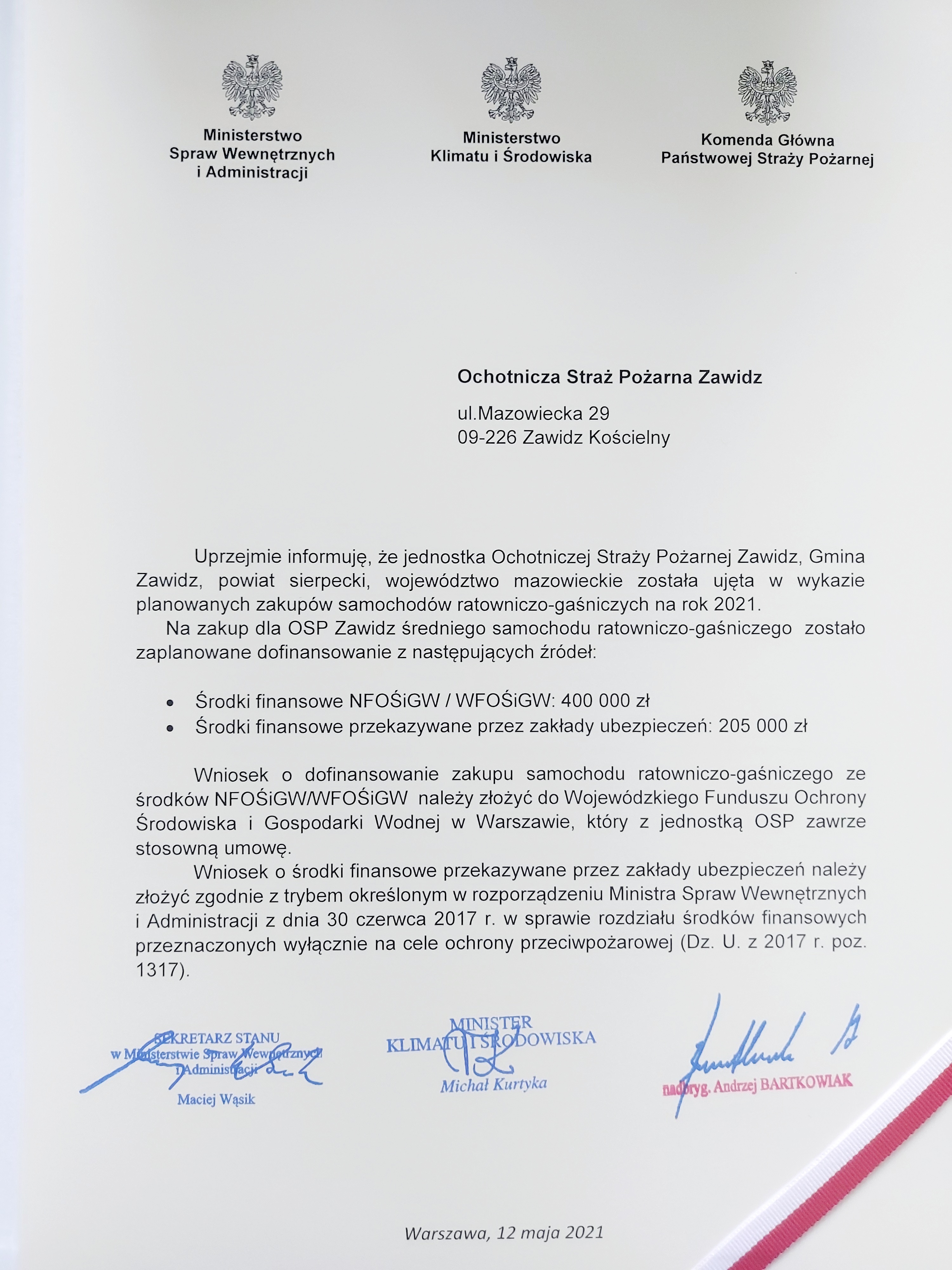 W dniu 13 maja 2021 roku w siedzibie Ochotniczej Straży Pożarnej w Szydłowie (pow. mławski) miała miejsce uroczysta zbiórka, podczas której wręczono akty włączenia do krajowego systemu ratowniczo – gaśniczego oraz promesy na zakup nowych średnich samochodów ratowniczo-gaśniczych. Z terenu powiatu sierpeckiego promesę na zakup nowego samochodu ratowniczo-gaśniczego otrzymała Ochotnicza Straż Pożarna /OSP/ w Zawidzu. Uroczystego wręczenia promesy przedstawicielowi OSP z Zawidza dokonali: Sekretarza Stanu w Ministerstwie Spraw Wewnętrznych i Administracji Maciej Wąsik, Komendant Główny Państwowej Straży Pożarnej /PSP/ nabryg. Andrzej Bartkowiak oraz Mazowiecki Komendant Wojewódzki PSP nadbryg. Jarosław Nowosielski.