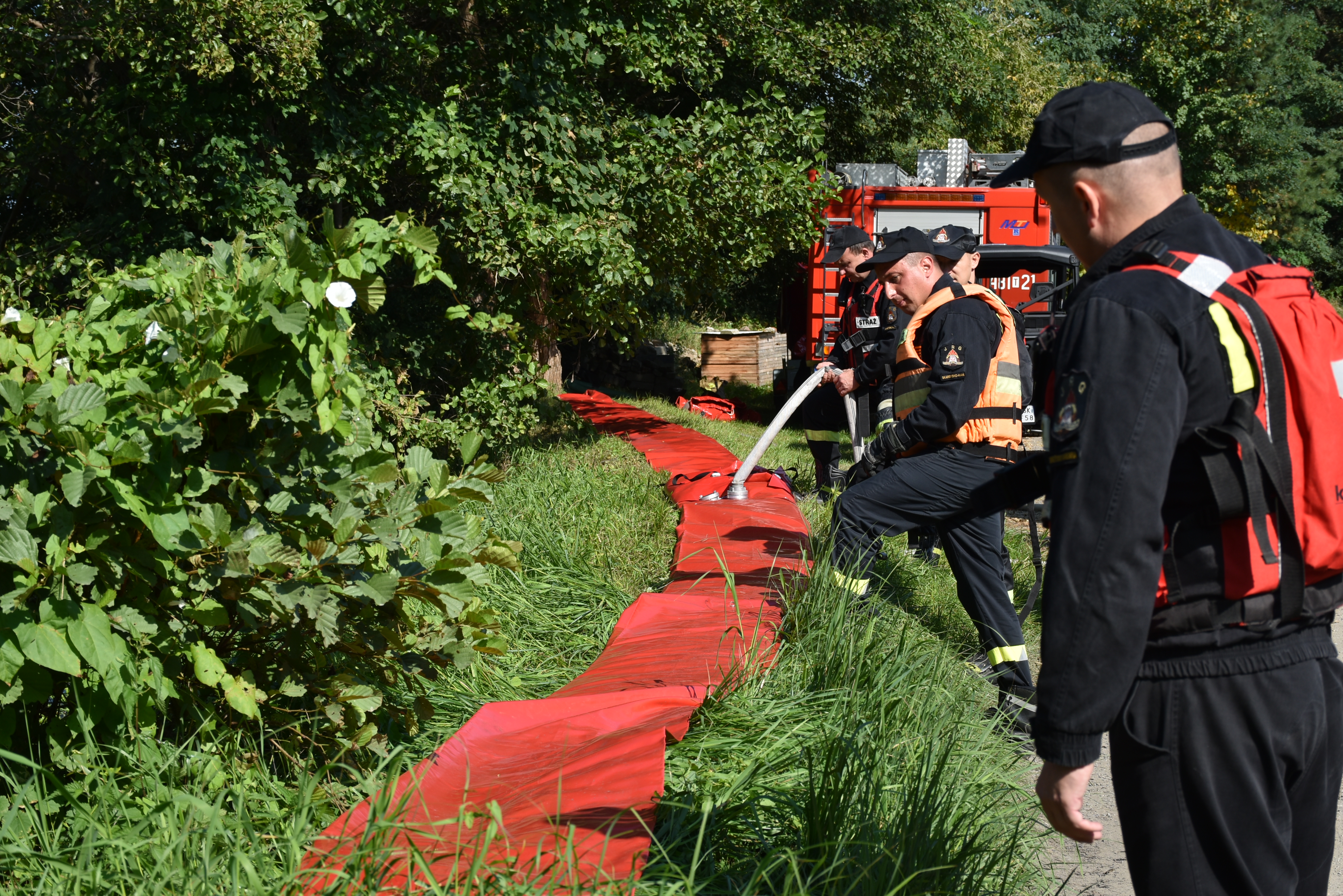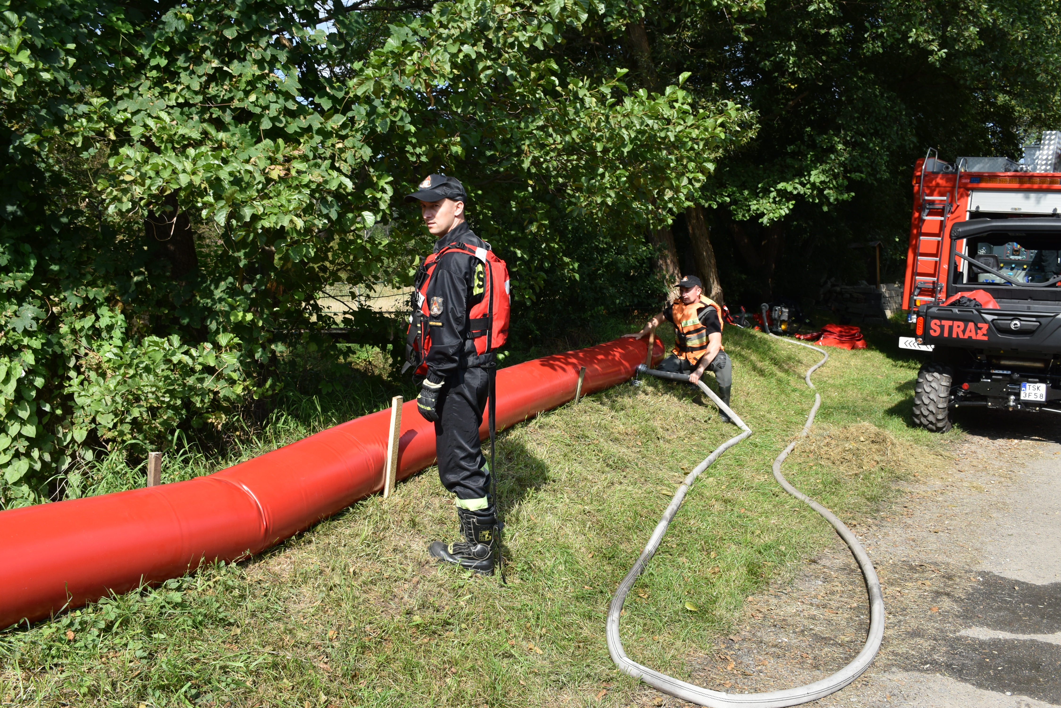 Jednym z elementów ćwiczeń było podwyższenie korony wału za pomocą sprzętu znajdującego się na wyposażeniu tutejszej komendy. W tym celu zostały sprawione rękawy powodziowe, które wypełniono wodą. Pozwoliły one na podniesienie korony wału w miejscu, w którym dochodziło do przelewania się wody z rzeki. W ćwiczeniach wykorzystano również ostatnio nabyty QUAD BRP CAN – AM, za pomocą którego patrolowano cały teren ćwiczeń.
