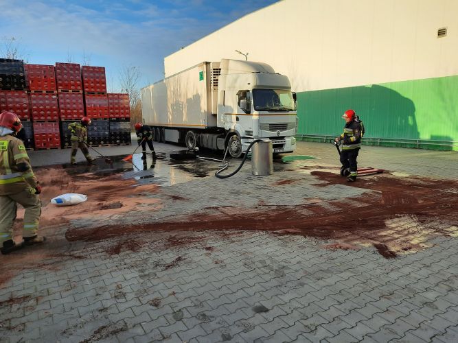W dniu 24.11.2020 w godzinach popołudniowych Dyżurny SKKP w Skarżysku Kamiennej otrzymał zgłoszenie o rozlanym oleju napędowym na placu hurtowni Eurocash S.A w Skarżysku Kamiennej. Wyciek paliwa nastąpił ze zbiornika samochodu ciężarowego Renault Premium który podczas manewrowania najechał na wysoki krawężnik uszkadzając zbiornik z paliwem. W zbiorniku znajdowało się około 400 l paliwa, które rozlało się na placu. . Działania zastępów SGRChem-Eko polegały na zabezpieczeniu miejsca zdarzenia i podłożeniu metalowej kuwety pod uszkodzony zbiornik paliwa. Jednocześnie przystąpiono do zabezpieczenia studzienek kanalizacyjnych i burzowych za pomocą sorbentu COMPACT . Dalsze działania polegały na przepompowaniu paliwa z podstawionej kuwety do zbiornika ze stali nierdzewnej. W tym samym czasie zbierane zostało rozlane paliwo z placu za pomocą łopat do podstawionych zbiorników. Podczas usuwania plamy została odkryta dodatkowa kratka burzowa, w której odkryto niewielką ilość zgromadzonego paliwa. W czasie akcji zostało przepompowane do zbiorników ok.100 litrów paliwa przy użyciu pompy membranowej. Dodatkowo kratka burzowa została zasypana sorbentem i oczyszczona. Pozostałe studzienki znajdujące się na placu hurtowni zostały skontrolowane - nie wykryto obecności paliwa. Działania trwały 3 godziny i brało w nich udział 4 zastępy- 12 strażaków z JRG Skarżysko Kamienna