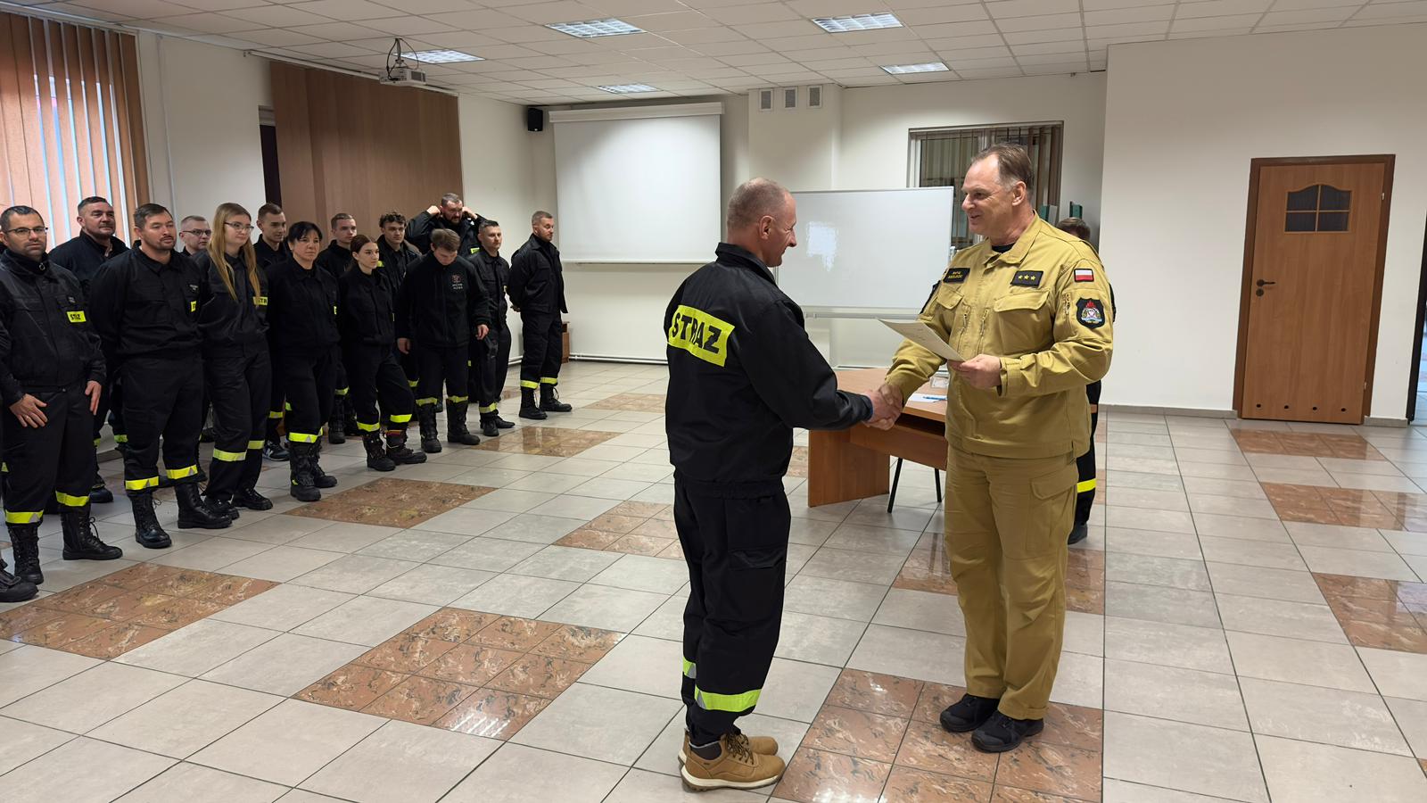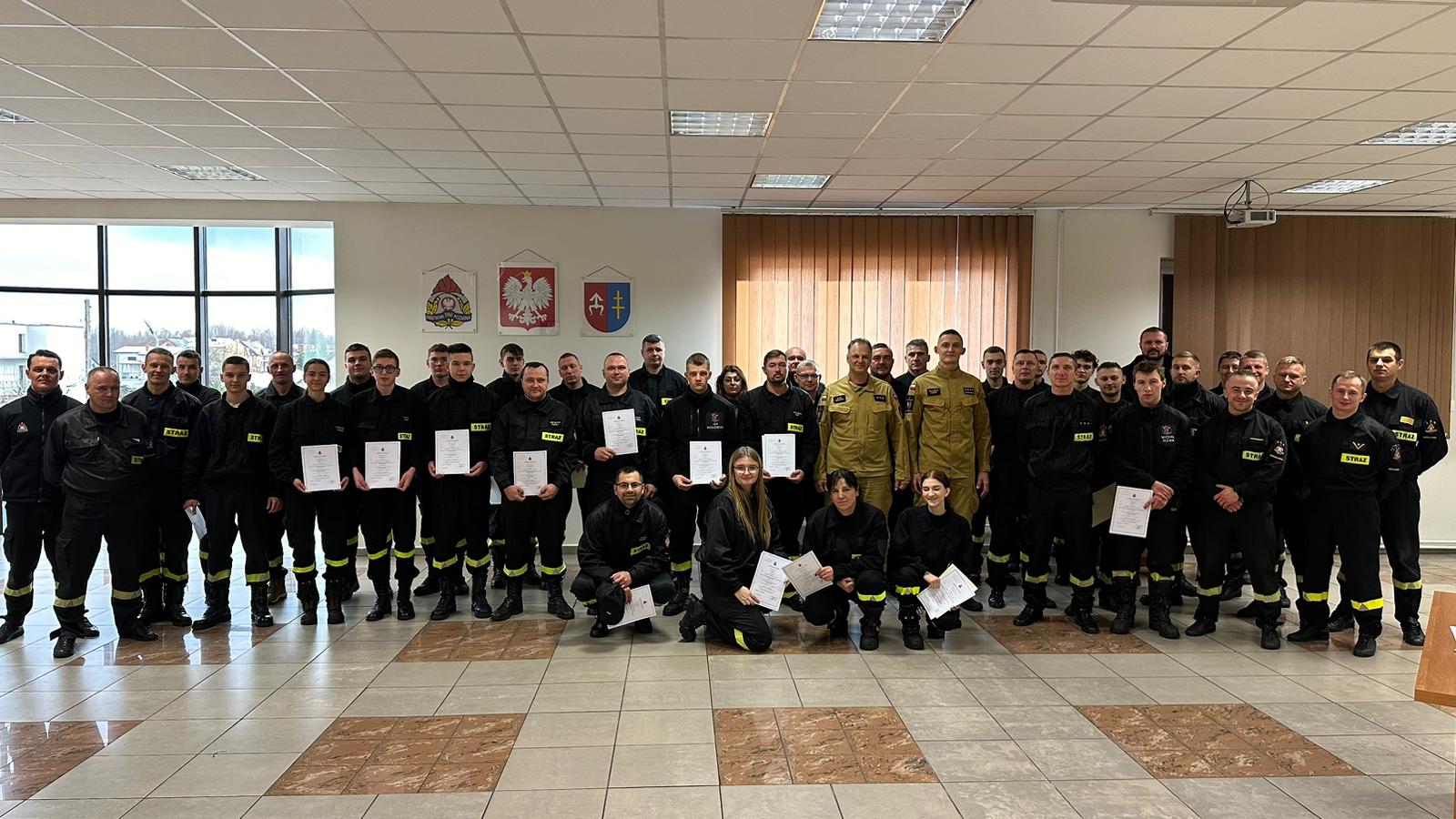 26 listopada 2023 roku w siedzibie Komendy Powiatowej Państwowej Straży Pożarnej w Skarżysku - Kamiennej zakończyło się szkolenie podstawowe strażaków ratowników Ochotniczych Straży Pożarnych z terenu powiatu skarżyskiego i powiatów ościennych. Druhowie, którzy chcą brać udział w akcjach ratowniczo gaśniczych od 23 września do 26 listopada w dni wolne od pracy przyswajali podstawową wiedzę z zakresu ochrony przeciwpożarowej. W czasie szkolenia realizowano tematykę dotyczącą taktyki działań ratowniczych i gaśniczych, udzielania kwalifikowanej pomocy przedmedycznej, podstawowych czynności z zakresu ratownictwa technicznego, podstawowych czynności z zakresu działań przeciwpowodziowych, zasad pracy radiowej sieci UKF Państwowej Straży Pożarnej oraz wydawania sygnałów i poleceń uczestnikom ruchu lub innym osobom znajdującym się na drodze. Uczestnicy odbyli również szkolenie teoretyczne i praktyczne z zakresu współpracy z SP ZOZ Lotnicze Pogotowie Ratunkowe. W ramach zajęć praktycznych z zakresu sprzętu ochrony układu oddechowego, druhowie uczestniczyli w szkoleniu w komorze dymowej w KW PSP w Kielcach. W szkoleniu tym udział brało 30 członków OSP ze wszystkich gmin powiatu skarżyskiego i 2 osoby z powiatu kieleckiego.