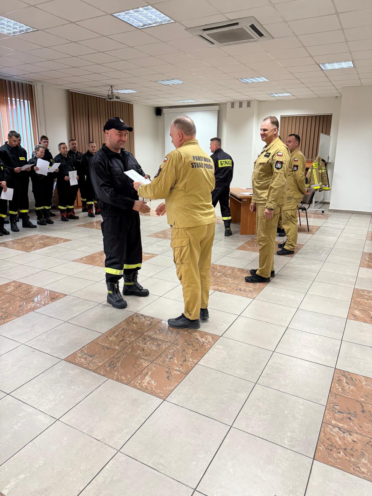 24 listopada 2024 roku w siedzibie Komendy Powiatowej Państwowej Straży Pożarnej w Skarżysku - Kamiennej zakończyło się szkolenie podstawowe strażaków ratowników Ochotniczych Straży Pożarnych z terenu powiatu skarżyskiego. Druhowie, którzy chcą brać udział w akcjach ratowniczo gaśniczych od 21 września do 24 listopada br. w dni wolne od pracy przyswajali podstawową wiedzę z zakresu ochrony przeciwpożarowej. W czasie szkolenia realizowano tematykę dotyczącą taktyki działań ratowniczych i gaśniczych, udzielania kwalifikowanej pomocy przedmedycznej, podstawowych czynności z zakresu ratownictwa technicznego, podstawowych czynności z zakresu działań przeciwpowodziowych, zasad pracy radiowej sieci UKF Państwowej Straży Pożarnej oraz wydawania sygnałów i poleceń uczestnikom ruchu lub innym osobom znajdującym się na drodze. Uczestnicy odbyli również szkolenie teoretyczne i praktyczne z zakresu współpracy z SP ZOZ Lotnicze Pogotowie Ratunkowe. W ramach zajęć praktycznych z zakresu sprzętu ochrony układu oddechowego, druhowie uczestniczyli w szkoleniu w komorze dymowej w KW PSP w Kielcach.