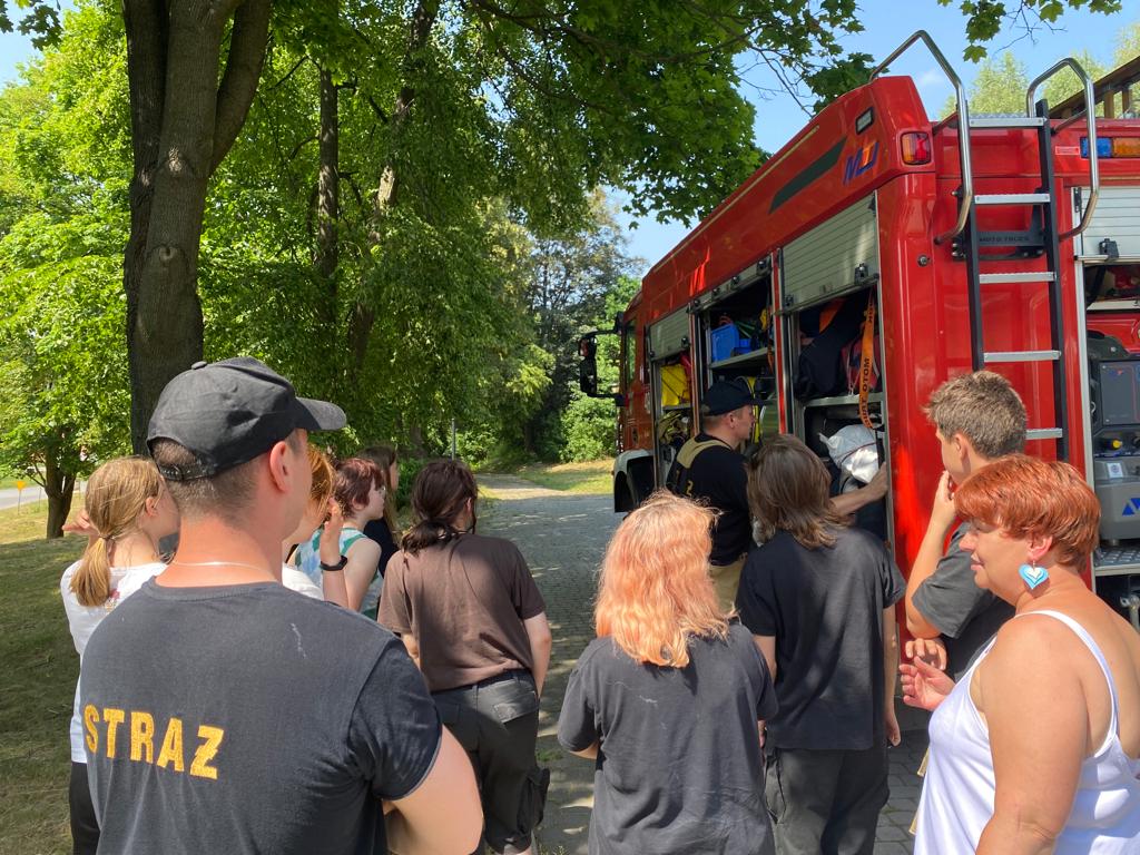 Wizytę rozpoczęto od zapoznania uczestników z zasadami udzielania kwalifikowanej pierwszej pomocy. Następnie omówiono bezpieczny wypoczynek nad wodą oraz poinstruowano jakie działania należy podjąć w przypadku kiedy zauważymy, że ktoś tonie. Przypomniano harcerzom numery alarmowe oraz poinformowano jak powinno wyglądać prawidłowe zgłoszenie do służb ratowniczych. Wypoczywającym uczestnikom obozu zaprezentowano sprzęt ratowniczo-gaśniczy będący na wyposażeniu samochodu.