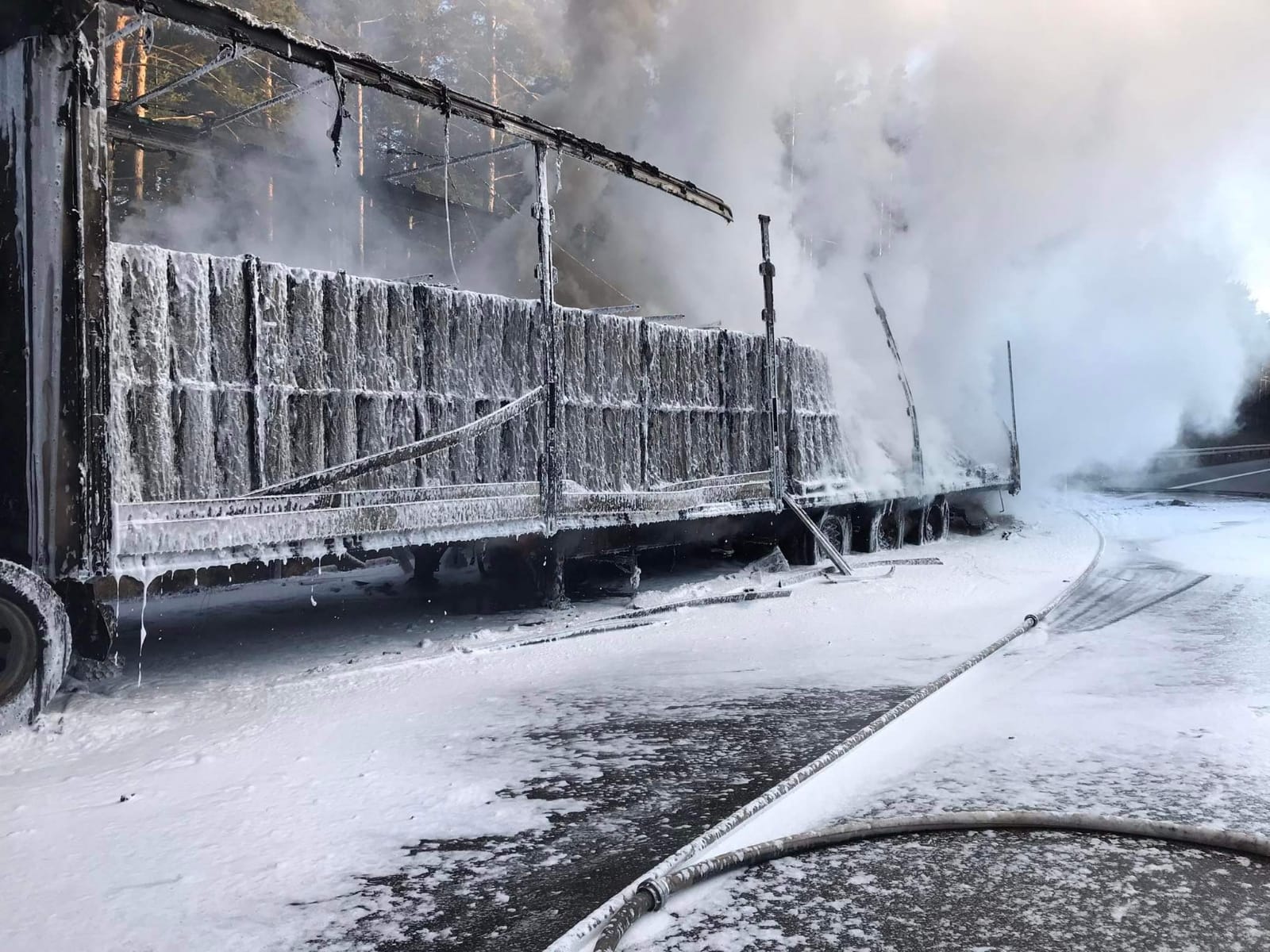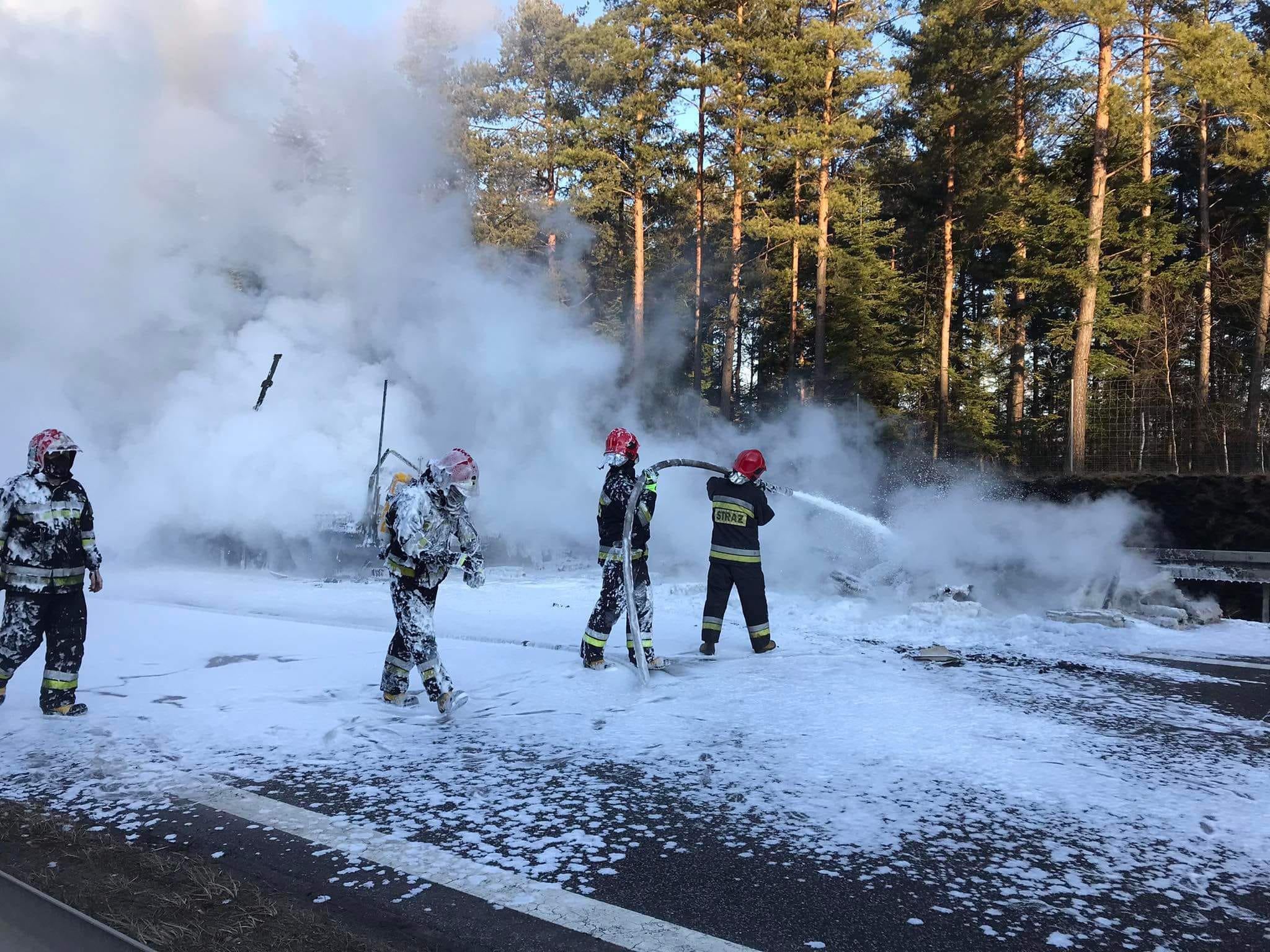 14 lutego 2022r. o godzinie 15:13 z Centrum Powiadamiania Ratunkowego w Kielcach do Stanowiska Kierowania Komendanta Powiatowego PSP w Skarżysku-Kamiennej wpłynęło zgłoszenie o pożarze naczepy ciągnika siodłowego przewożącego folię wielowarstwową w rolkach. Pożar miał miejsce pomiędzy miejscowościami Łączna i Suchedniów na trasie S7 w kierunku Warszawy. Po dojeździe na miejsce zdarzenia jednostek ochrony przeciwpożarowej zostały podane 2 prądy piany ciężkiej. Jeden na palącą się naczepę, a drugi w obronie ciągnika siodłowego oraz reszty ładunku. Ponadto działania strażaków polegały na zabezpieczeniu miejsca zdarzenia, sprawdzeniu kamerą termowizyjną obecności ukrytych zarzewi ognia oraz odłączeniu napięcia w akumulatorach pojazdu. Po ugaszeniu pożaru strażacy przystąpili do rozwijania najbardziej nadpalonej folii i przelewania jej wodą. Na zakończenie działań spłukali pianę gaśniczą z jezdni za pomocą prądu wody. Na czas trwania działań do godziny około 17:30 ruch na trasie w kierunku Warszawy został wstrzymany przez Policję, która zorganizowała objazd. W działaniach brały udział 4 zastępy z JRG Skarżysko-Kamienna oraz 3 zastępy OSP z terenu powiatu, łącznie 28 strażaków.