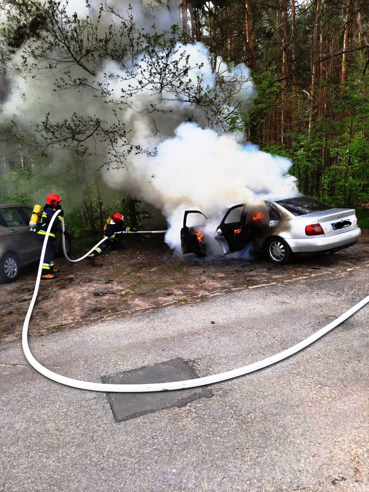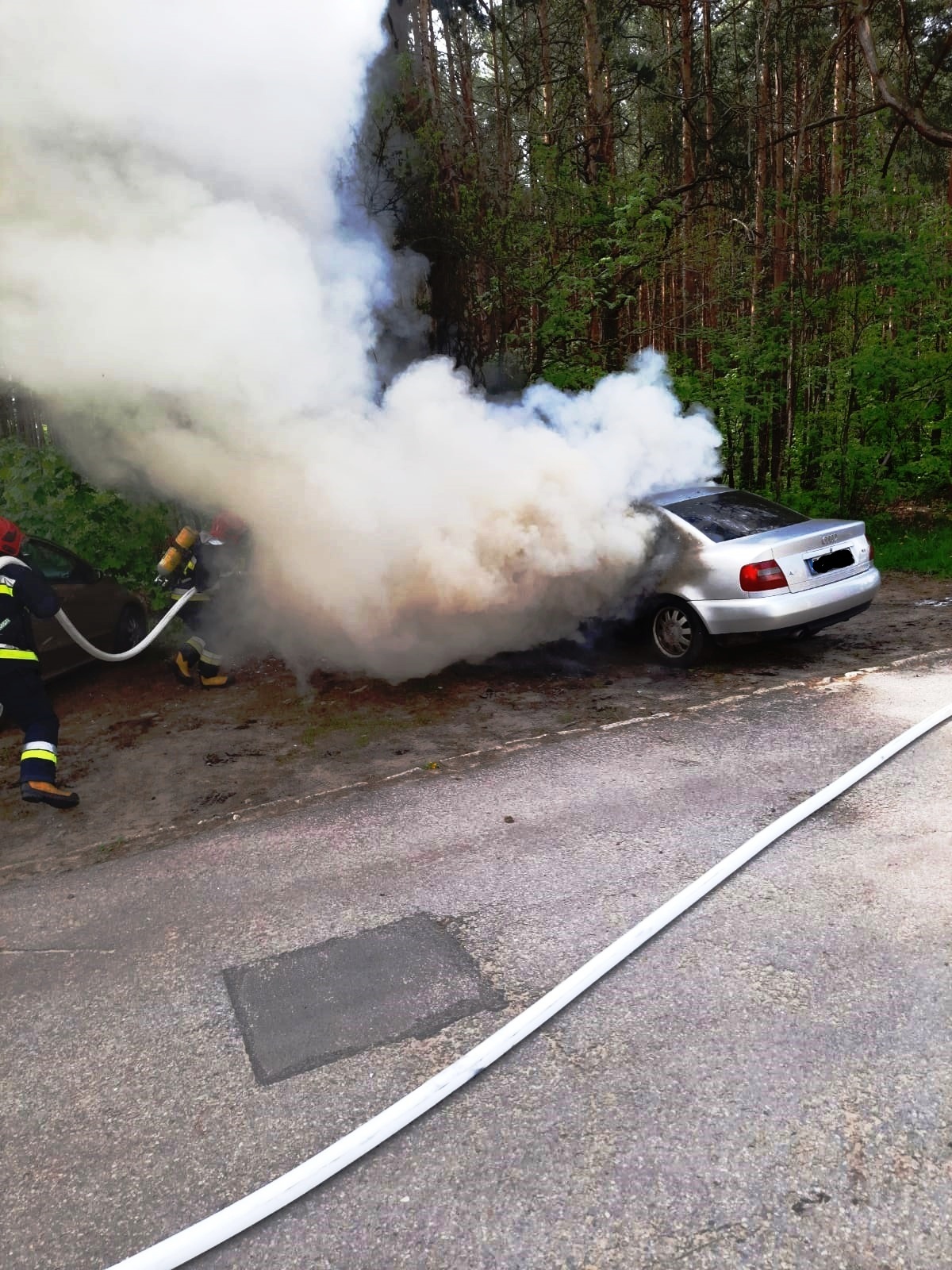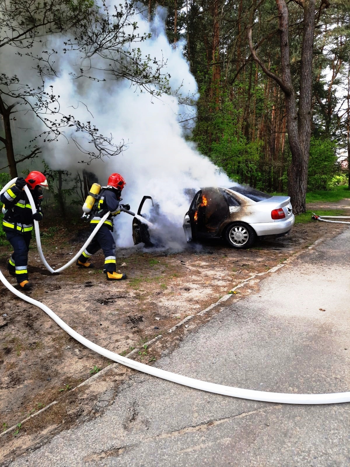 24 maja 2021r. o godzinie 10:49 z Centrum Powiadamiania Ratunkowego w Kielcach wpłynęło zgłoszenie o pożarze samochodu osobowego w Skarżysku-Kamiennej przy ul. Partyzantów na parkingu przy lesie. Po dojeździe na miejsce zdarzenia zastępu z JRG Skarżysko-Kamienna pożarem objęty był cały przód pojazdu aż do tylnej kanapy pasażera. Działania zastępu z JRG polegały na zabezpieczeniu miejsca zdarzenia oraz podaniu jednego prądu piany ciężkiej na palący się samochód. Po ugaszeniu pożaru przystąpiono do schładzania zbiornika z LPG, po czym zakręcono jego zawór. Czynności wyjaśniające w tej sprawie prowadzi KPP Policji w Skarżysku-Kamiennej.
