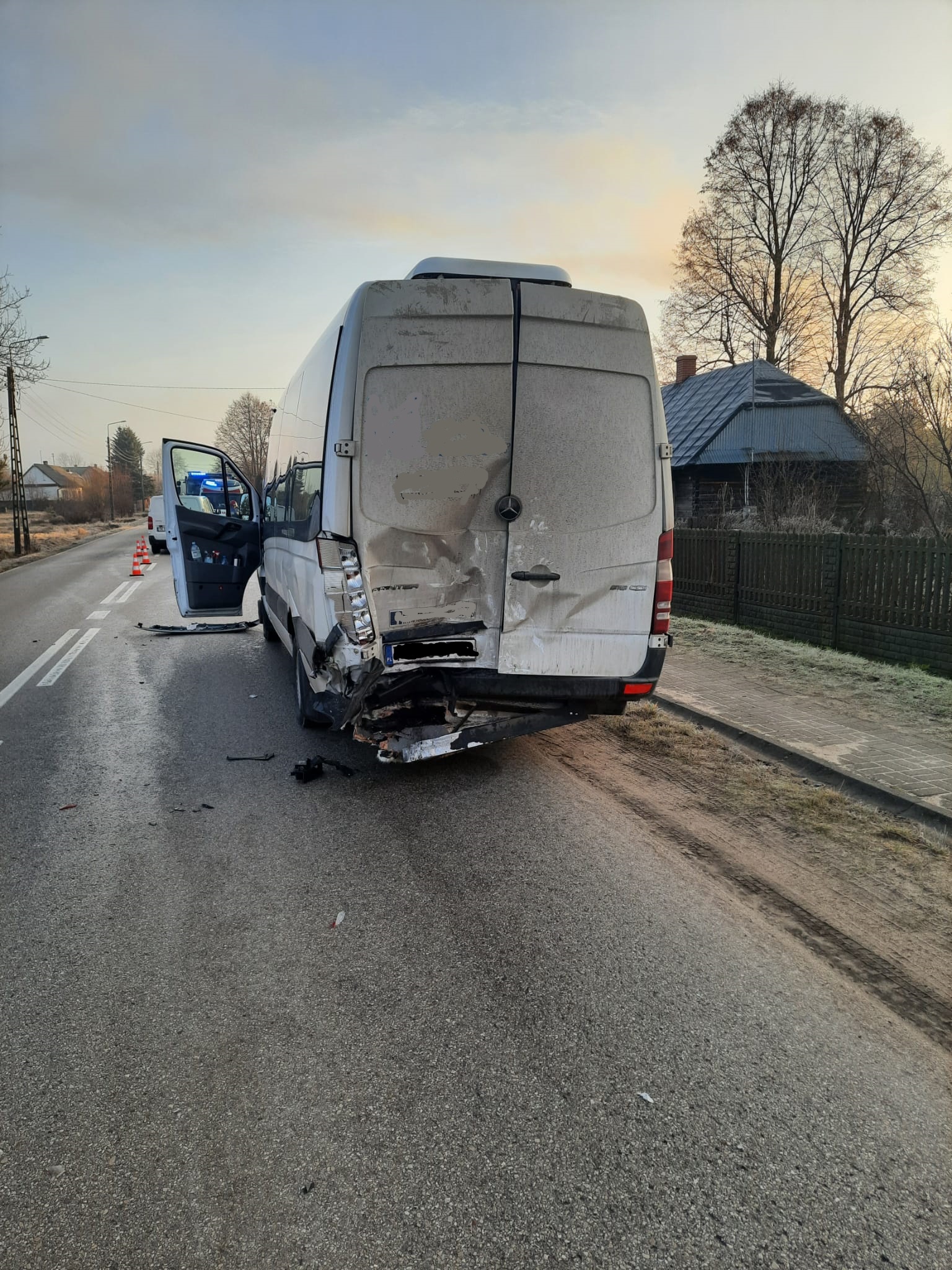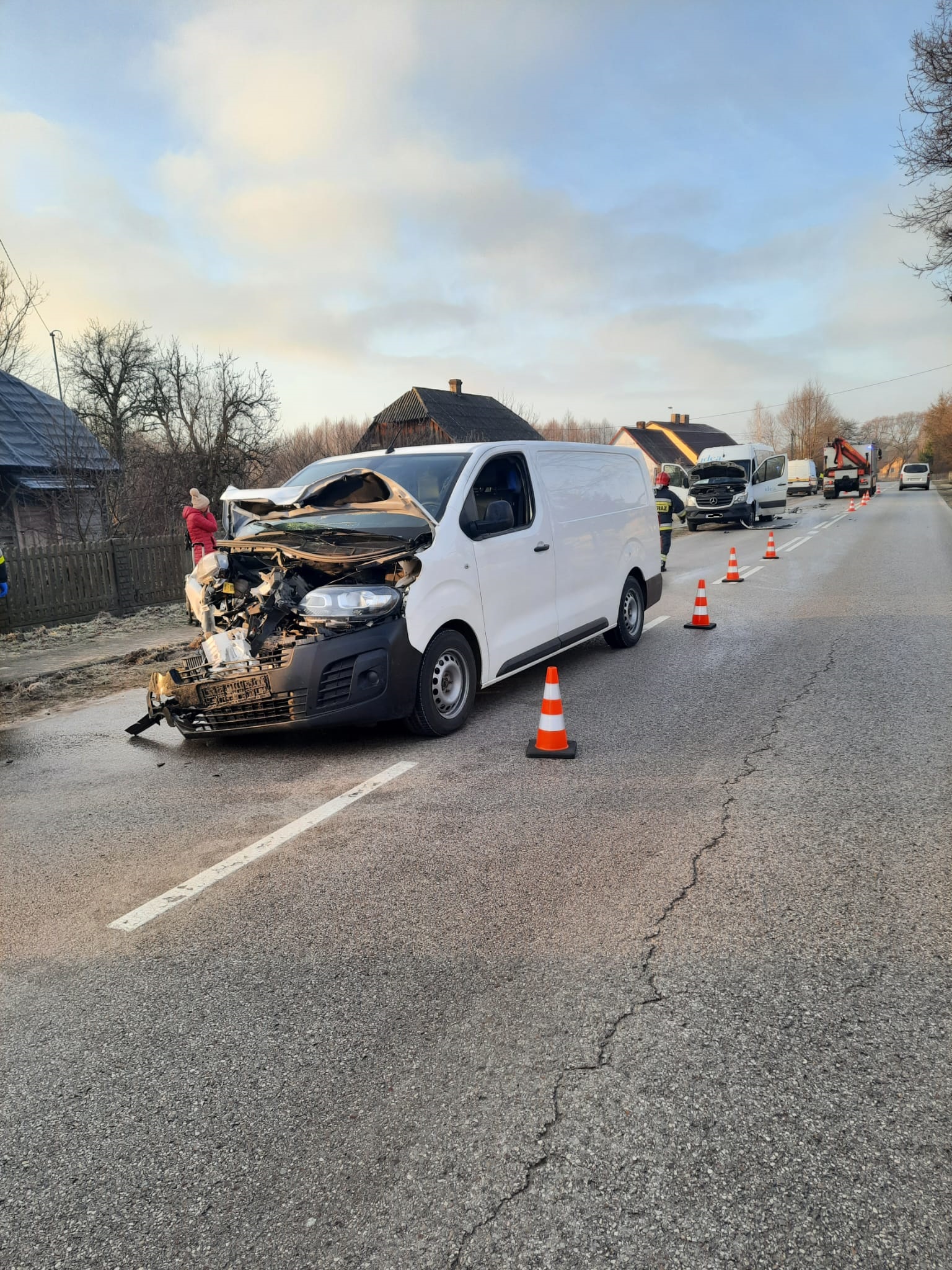 Kolejne zdarzenie drogowe miało miejsce około godziny ósmej w Suchedniowie na ul. Langiewicza. W zdarzeniu tym uczestniczyły dwa pojazdy. Samochód dostawczy, którym podróżował tylko kierowca i bus kursowy, którym podróżowało łącznie 5 osób. W wyniku zderzenia w/w pojazdów, kierowca samochodu dostawczego oraz pasażer busa kursowego zostali zabrani do szpitala na dalsze badania specjalistyczne. Działania strażaków polegały na zabezpieczeniu miejsca zdarzenia, odłączeniu akumulatorów w pojazdach i sorpcji rozlanych płynów eksploatacyjnych.