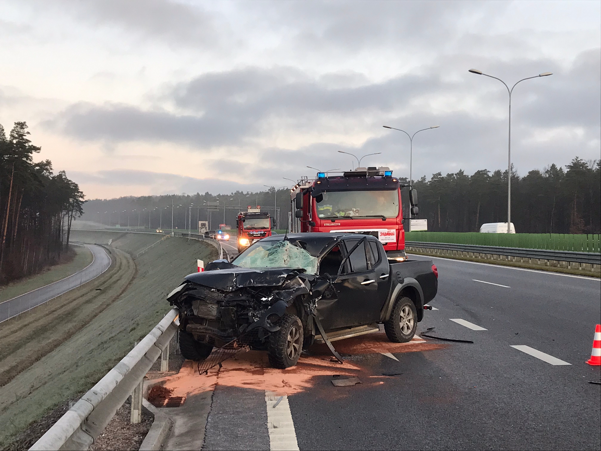 11 stycznia br. przed godziną siódmą do Stanowiska Kierowania Komendanta Powiatowego w Skarżysku-Kamiennej wpłynęło zgłoszenie o kolizji drogowej na trasie S7 w kierunku Krakowa, na zjeździe na węzeł Skarżysko-Kamienna Zachód. Po dojeździe na miejsce zdarzenia zastępów z JRG Skarżysko-Kamienna oraz JRG Szydłowiec okazało się, że w zdarzeniu brał udział samochód osobowy, który uderzył w tył samochodu ciężarowego. Nadjeżdżający kierowca innego pojazdu osobowego, widzący zaistniałe zdarzenie chcąc bezpiecznie ominąć uszkodzone pojazdy, wpadł w poślizg i uderzył w bariery energochłonne. Pojazdami, które uczestniczyły w/w zdarzeniu podróżowali tylko kierowcy i po przebadaniu przez obecny na miejscu ZRM, jeden z nich został zabrany do szpitala na dalsze badania. Działania strażaków polegały na zabezpieczeniu miejsca zdarzenia, odłączeniu akumulatorów w pojazdach i sorpcji rozlanych płynów eksploatacyjnych.