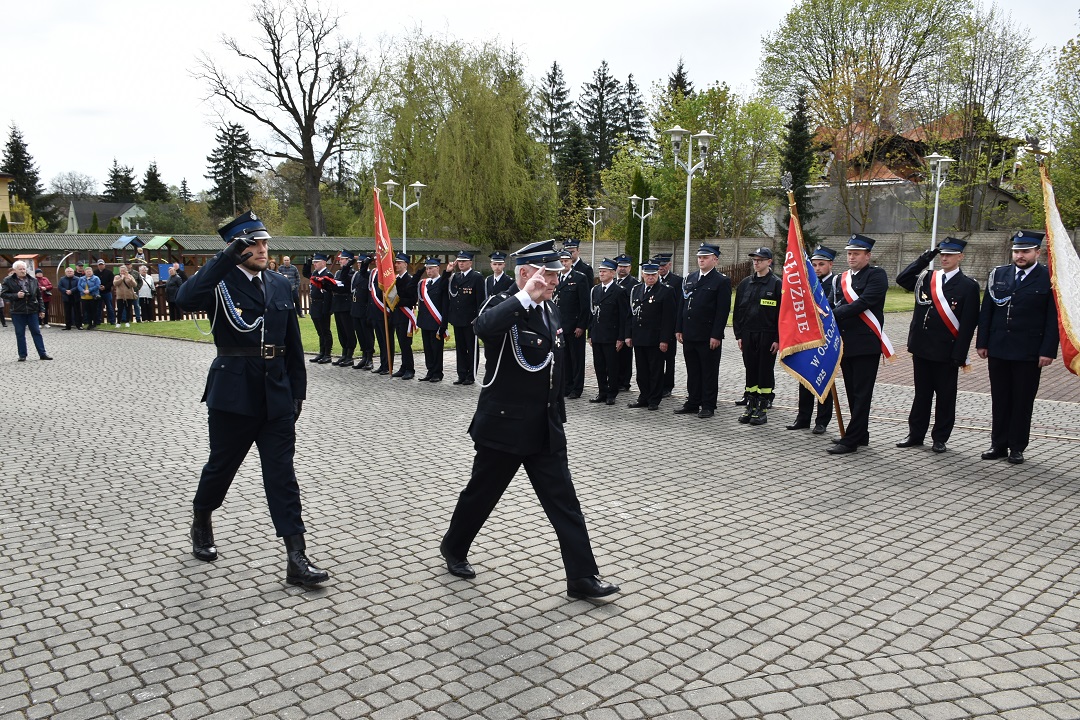 Uroczystość przebiegała zgodnie z ceremoniałem strażackim. Jej oficjalną część rozpoczął dowódca uroczystości druh Mateusz Spadło od złożenia meldunku na ręce Marszałka Województwa Świętokrzyskiego a zarazem Wice Prezes Zarządu Oddziału Wojewódzkiego Związku Ochotniczych Straży Pożarnych Rzeczpospolitej Polskiej druha Andrzej Bętkowskiego. Po przyjęciu meldunku nastąpiło uroczyste podniesienie flagi państwowej na maszt z odegraniem hymnu narodowego.