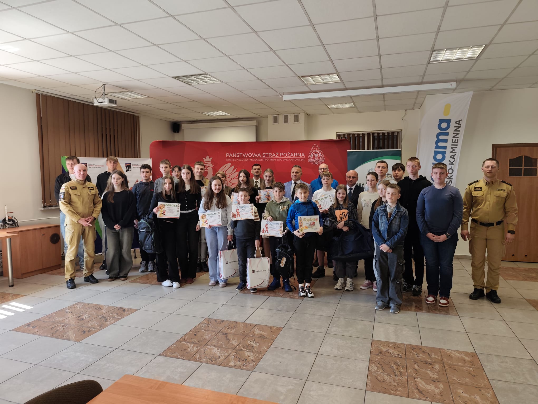 Laureaci poszczególnych kategorii otrzymali nagrody z rąk Starosty Skarżyskiego Pana Artura Berusa, Komendanta Powiatowego mł. bryg. Sławomira Wawrzaka oraz Pani Izabeli Hajdenrajch-Pasteczka – Starszy Specjalista ds. zagospodarowania terenu i ochrony ppoż., i Pana Dariusza Nowaka – Dyspozytor punktu alarmowo-dyspozycyjnego Nadleśnictwa Skarżysko. Nagrodę dla najmłodszego uczestnika wręczył Pan Andrzej Łosak – Dyrektor ds. logistyki ze sklepu Castorama w Skarżysku-Kamiennej. Podczas wręczenia nagród obecni byli również przedstawiciele urzędów miasta Skarżyska, Suchedniowa oraz gminy Bliżyn, Łączna i Skarżyska Kościelnego