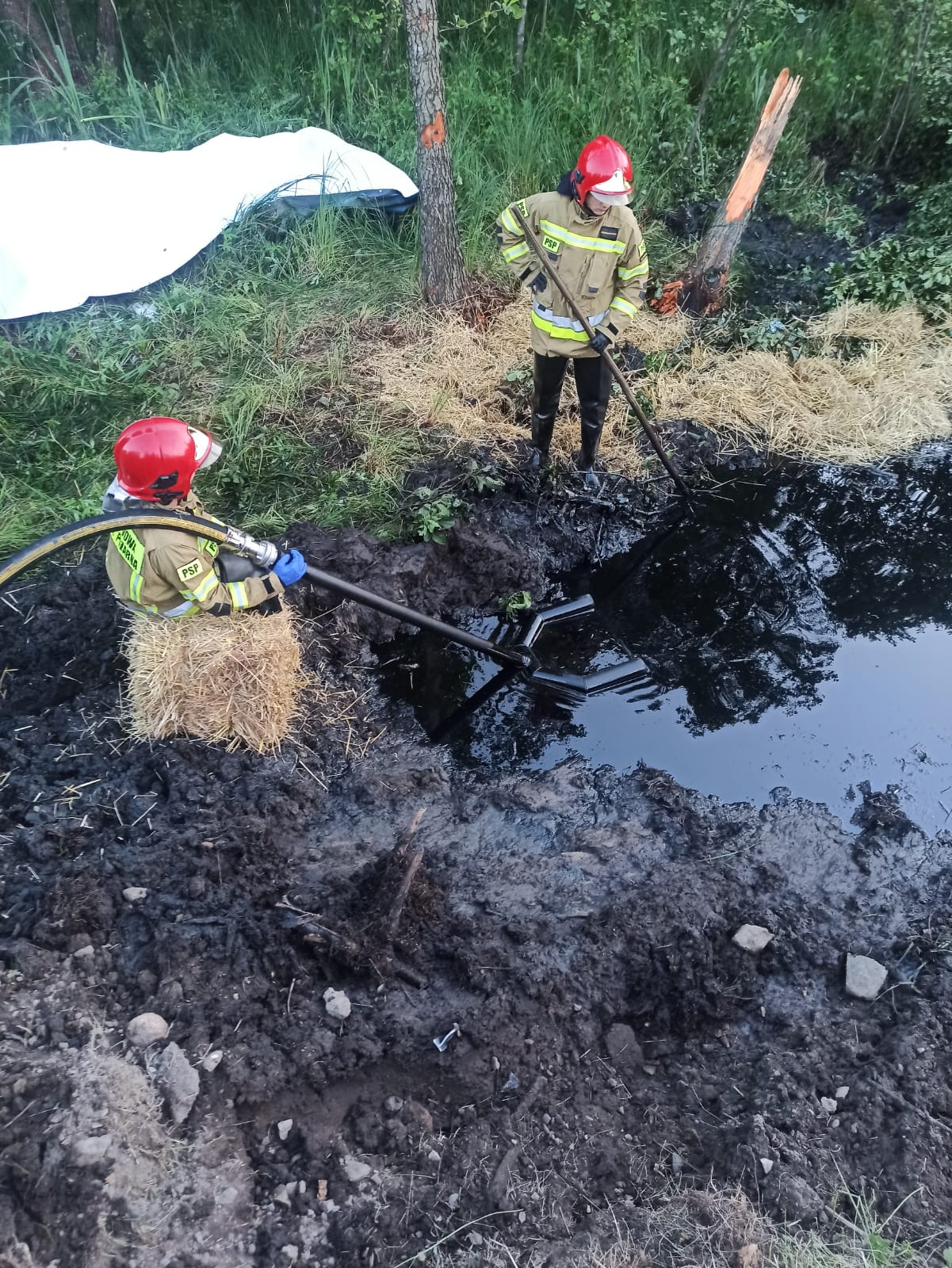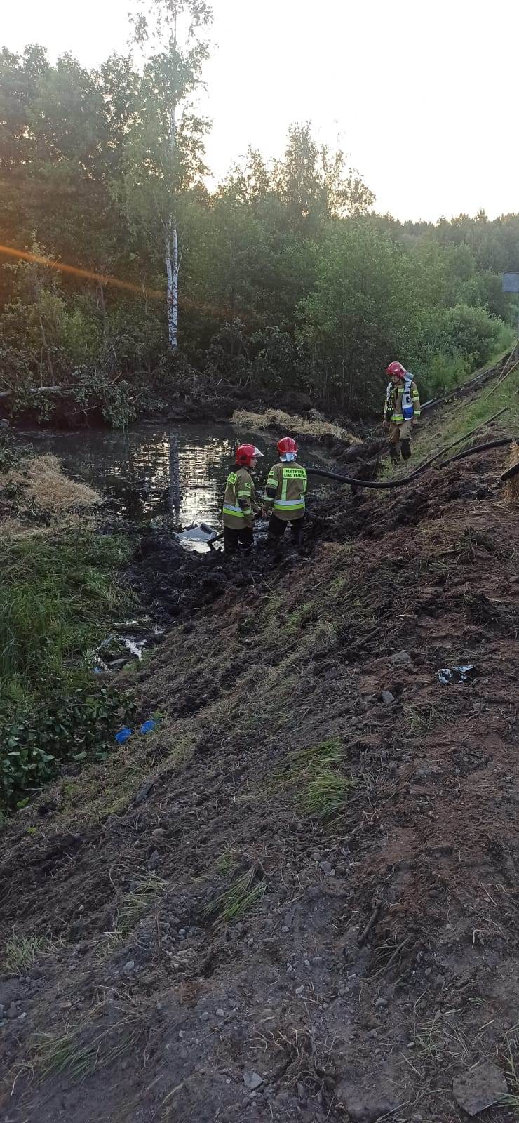03 sierpnia 2022r. po godzinie osiemnastej do Stanowiska Kierowania Komendanta Powiatowego Państwowej Straży Pożarnej w Skarżysku-Kamiennej wpłynęła dyspozycja ze Stanowiska Kierowania Komendanta Wojewódzkiego w Kielcach o zadysponowanie Specjalistycznej Grupy Ratownictwa Chemiczno-Ekologicznego „Skarżysko” do interwencji na terenie powiatu koneckiego. Na miejscu działań pracował już zastęp z JRG Końskie oraz OSP Ruda Maleniecka. Z informacji uzyskanych od kierującego działaniami ratowniczymi wynikało, że po wypadku samochodu ciężarowego z samochodem osobowym, doszło do wycieku płynów eksploatacyjnych z ciężarówki do przydrożnego zbiornika wodnego. Po dojeździe grupy chemicznej na miejsce zdarzenia w miejscowości Cieklińsko, gmina Ruda Maleniecka przy drodze krajowej nr 74 i wstępnym rozpoznaniu chemicznym, potwierdzono wyciek substancji ropopochodnych do przydrożnego zbiornika wodnego, z którego została wyciągnięta ciężarówka. Działania grupy polegały na zebraniu substancji z powierzchni wody za pomocą skimera ręcznego i pompy do substancji chemicznych do podstawionych pojemników.