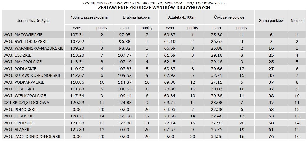 Po podsumowaniu wyników świętokrzyscy strażacy zespołowo zajęli drugie miejsce w klasyfikacji generalnej Mistrzostw Polski w Sporcie Pożarniczym. Wygrała reprezentacja województwa mazowieckiego, która minimalnie wyprzedziła nasz zespół o 1pkt. Trzecie miejsce zdobyła drużyna z województwa warmińsko-mazurskiego.
