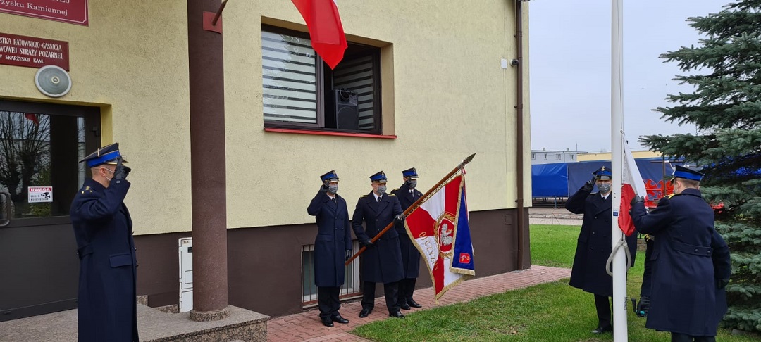 Z okazji Święta Niepodległości 11 listopada strażacy z Jednostki Ratowniczo-Gaśniczej podczas zmiany służby dokonali uroczystego wciągnięcia flagi państwowej na maszt przy komendzie powiatowej PSP w Skarżysku-Kamiennej.