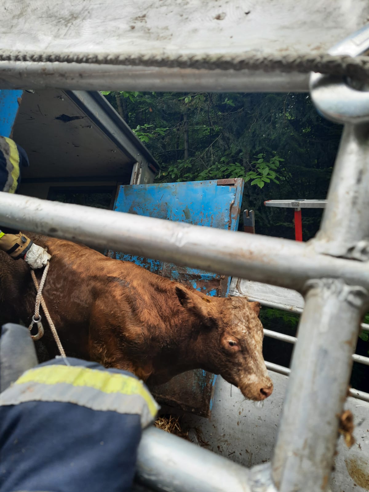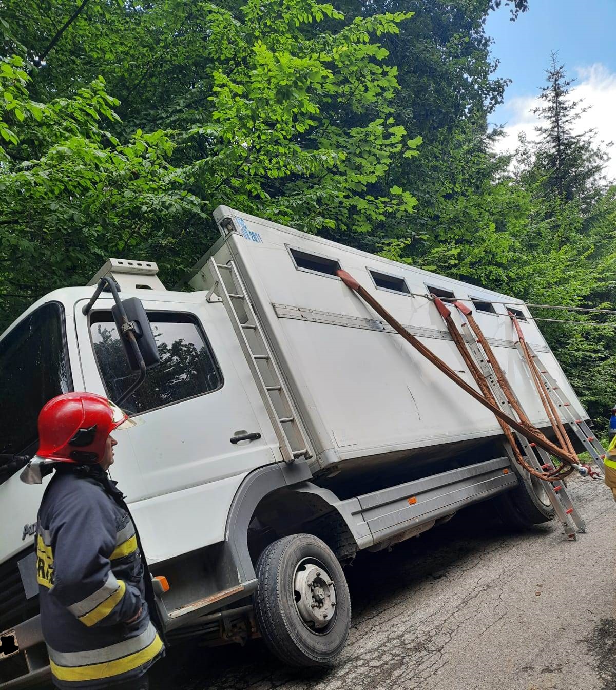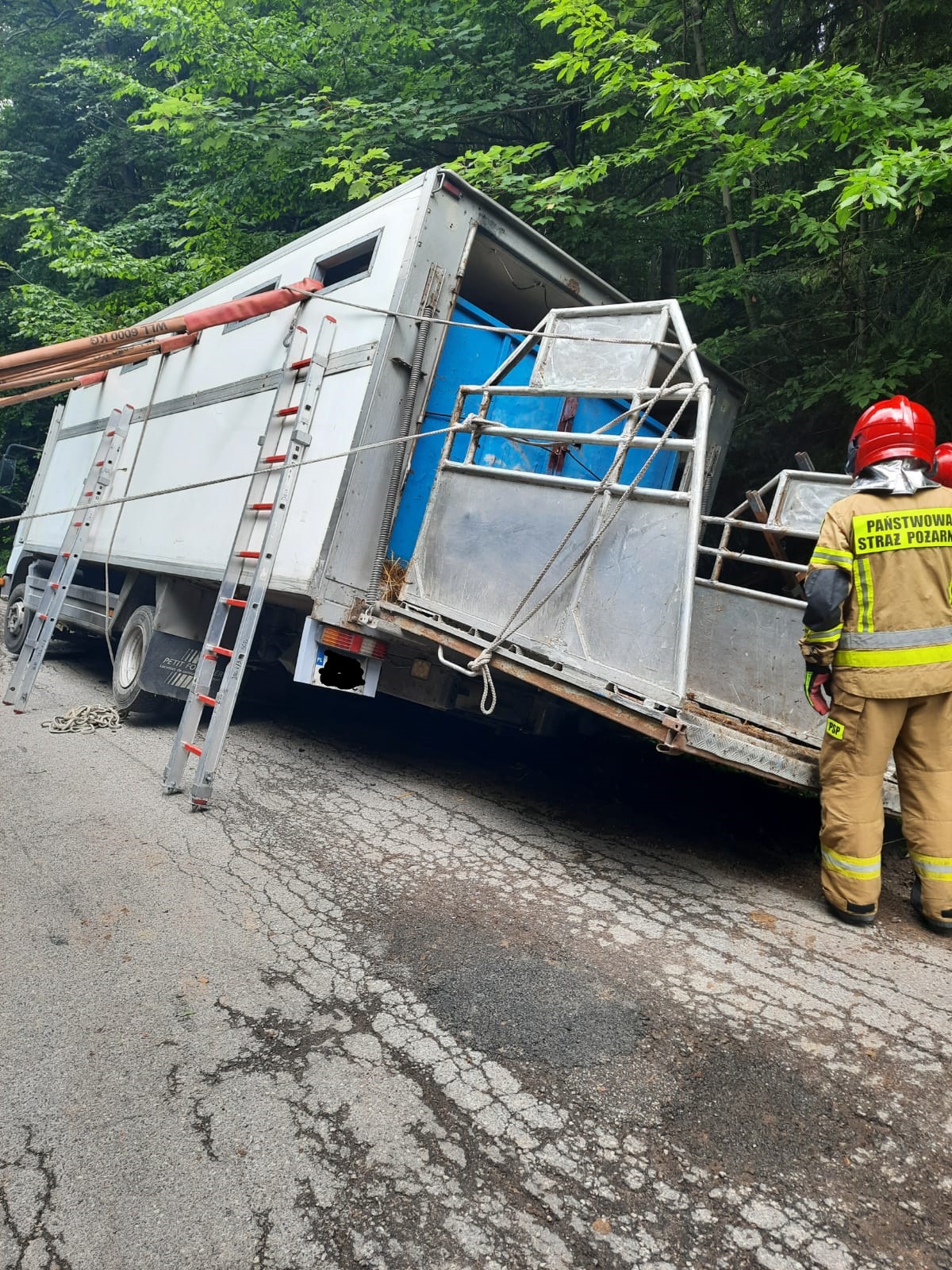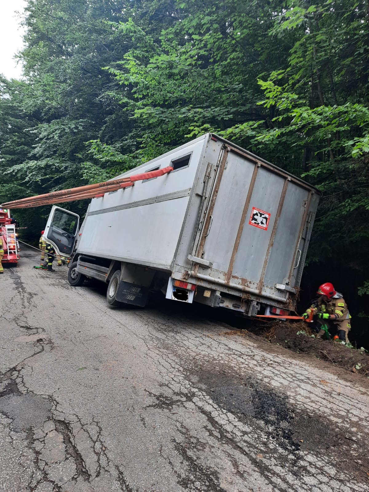 06 lipca 2022r. przed godziną 12-stą do Stanowiska Kierowania Komendanta Powiatowego Państwowej Straży Pożarnej w Skarżysku-Kamiennej wpłynęło zgłoszenie o wypadku samochodu ciężarowego przewożącego około 20 sztuk bydła w miejscowości Klonów, gmina Łączna, powiat skarżyski. Po dojeździe na miejsce zdarzenia pierwszych jednostek ochrony przeciwpożarowej stwierdzono, że samochód ciężarowy przewożący około 20 sztuk bydła jadący w stronę Psar, wjechał na grząskie pobocze i osunął się do rowu. Szczęśliwie pojazd nie wywrócił się na bok tylko został mocno przechylony. Po dokładniejszym rozeznaniu w sytuacji kierujący działaniem ratowniczym poprosił o zadysponowanie na miejsce zdarzenia ciężkiego samochodu ratownictwa technicznego z JRG 1 Kielce, który umożliwi wyciągnięcie ciężarówki z rowu. Oczekując na przyjazd ciężkiego sprzętu strażacy zabezpieczyli miejsce zdarzenia, zabezpieczyli pojazd przed przewróceniem się za pomocą lin, drabin i podpór. Na miejsce zdarzenia przybyła także Powiatowa Inspekcja Weterynaryjna, która zbadała zwierzęta. 18 sztuk bydła zostało zabrane w dalszą drogę przez podstawiony pojazd zastępczy. Niestety 2 sztuki bydła w wyniku odniesionych obrażeń padło i zostało przekazano do utylizacji. W zdarzeniu brało udział w sumie 10 zastępów PSP i OSP w sile 34 osób. W tym Specjalistyczna Grupa Ratownictwa Technicznego „Kielce”.