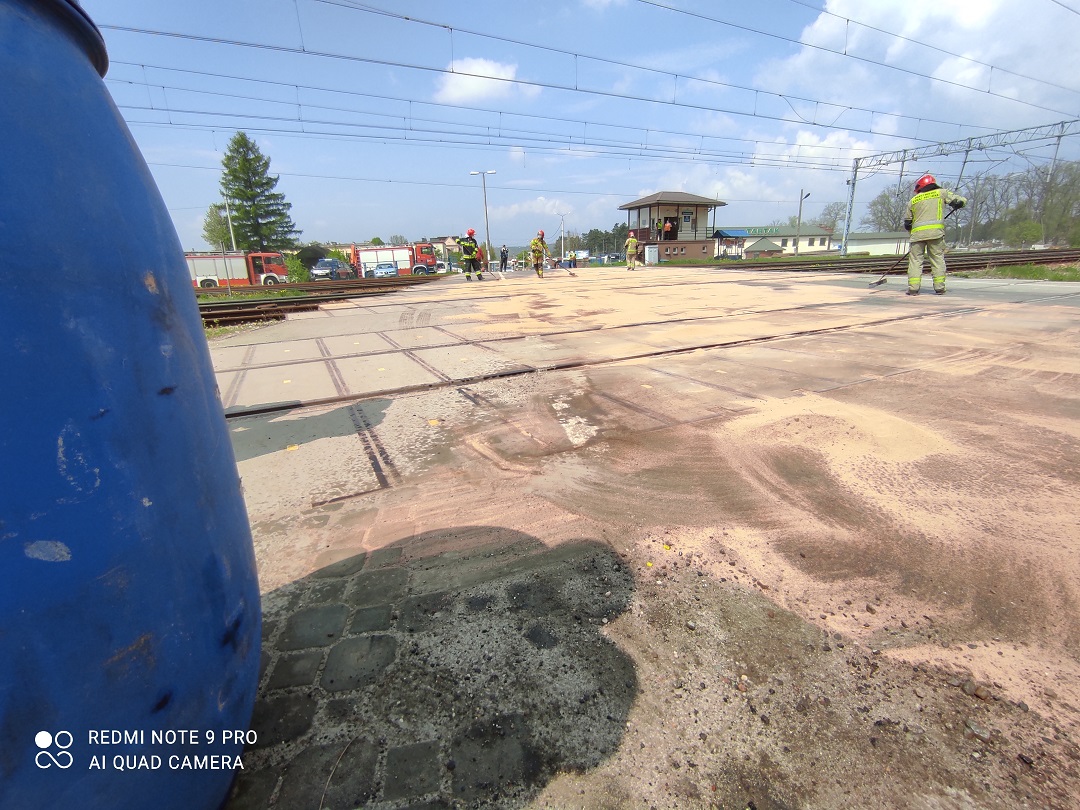 14 maja 2021r. o godzinie 10:15 z Centrum Powiadamiania Ratunkowego w Kielcach wpłynęło zgłoszenie o uszkodzeniu sieci trakcyjnej na przejeździe kolejowym znajdującym się w Suchedniowie na ul. Bugaj. Po dojeździe na miejsce zdarzenia zastępów JRG Skarżysko-Kamienna stwierdzono, że samochód ciężarowy z podnośnikiem hydraulicznym HDS zahaczył ramieniem o przewód trakcyjny, który został zerwany. W wyniku zdarzenia z ramienia HDS wyciekł olej hydrauliczny na przejazd kolejowy. Na szczęście nikt nie został poszkodowany. Działania straży polegały na zabezpieczeniu miejsca zdarzenia, zamknięciu rogatek na przejeździe kolejowym dla ruchu drogowego i sorpcji rozlanego oleju za pomocą sorbentu Compact. Na czas prowadzenia działań ruch kolejowy na trasie Kraków – Warszawa został chwilowo wstrzymany przez pracowników kolei. Uszkodzenie przewodu trakcyjnego spowodowało automatyczne rozłączenie zasilania elektrycznego w sieci. Dalsze czynności wyjaśniające prowadzi KPP w Skarżysku-Kamiennej.