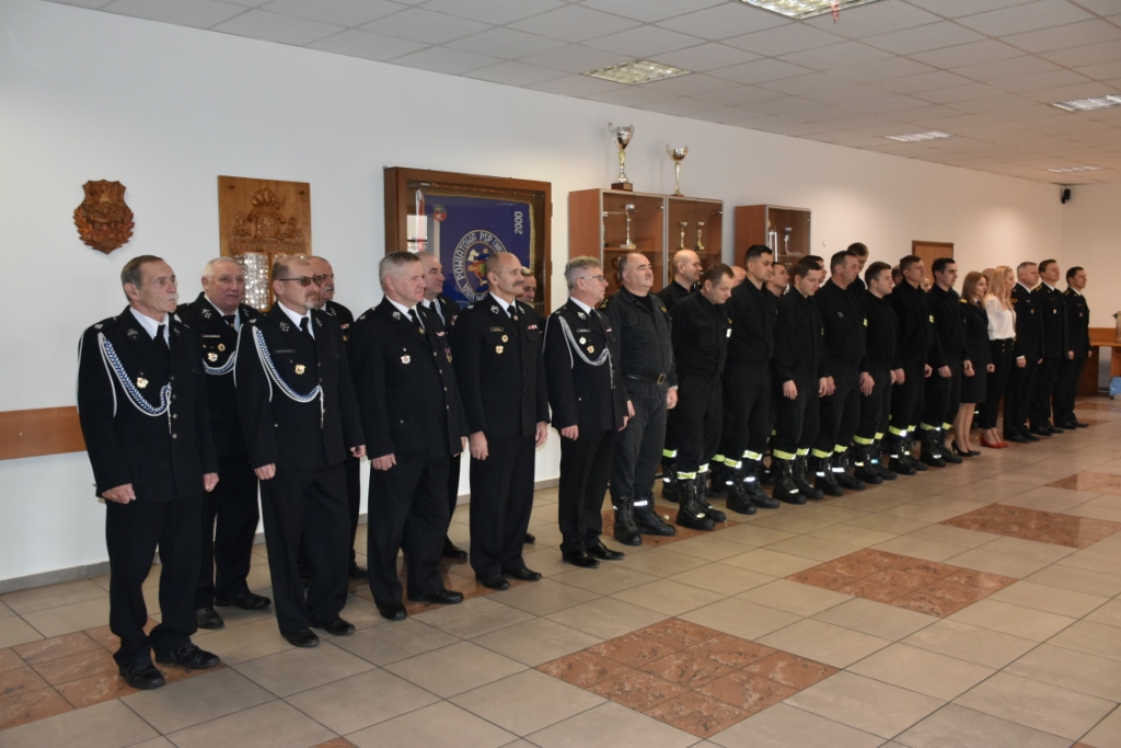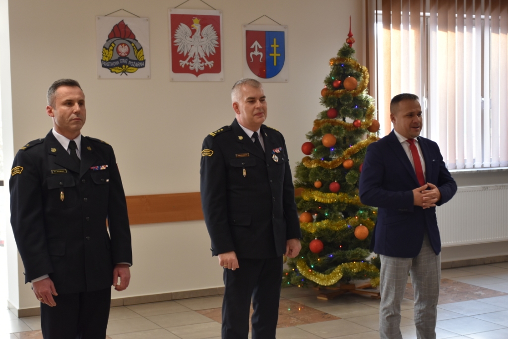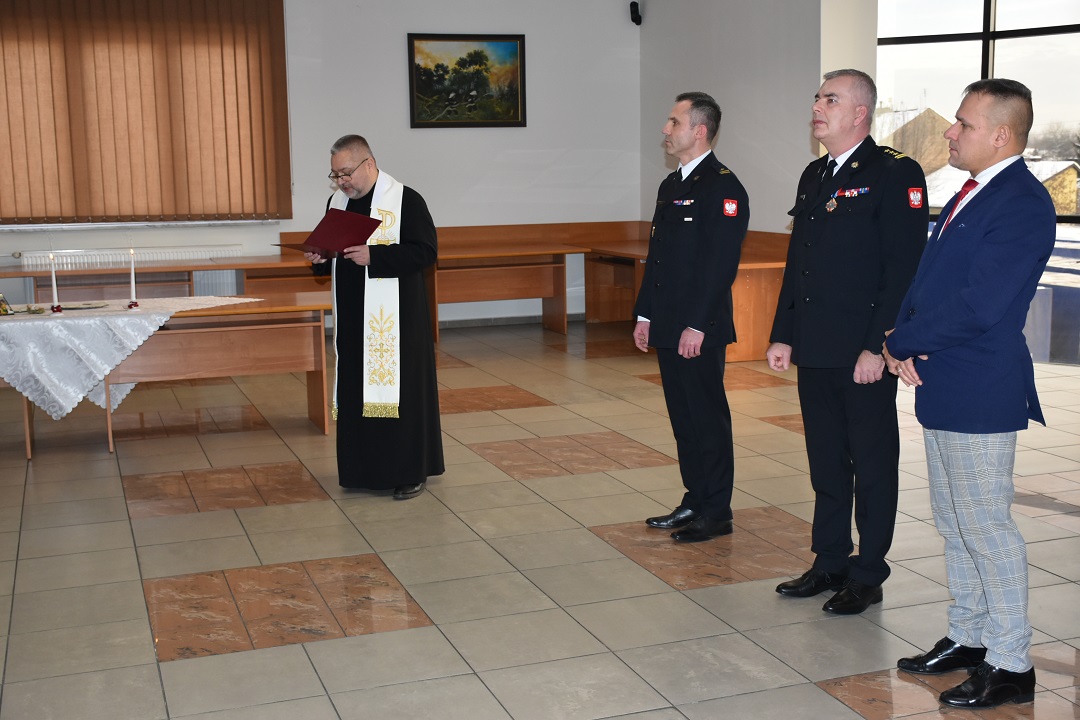 Po przywitaniu wszystkich uczestników spotkania przez p.o. Komendanta Powiatowego PSP w Skarżysku-Kamiennej mł. bryg. Marcina Jasińskiego, obecny na uroczystym spotkaniu ks. Marek Porczyński z Parafii Matki Bożej Ostrobramskiej odczytał fragment pisma świętego. Następnie wszyscy odśpiewali wspólnie kolędę.