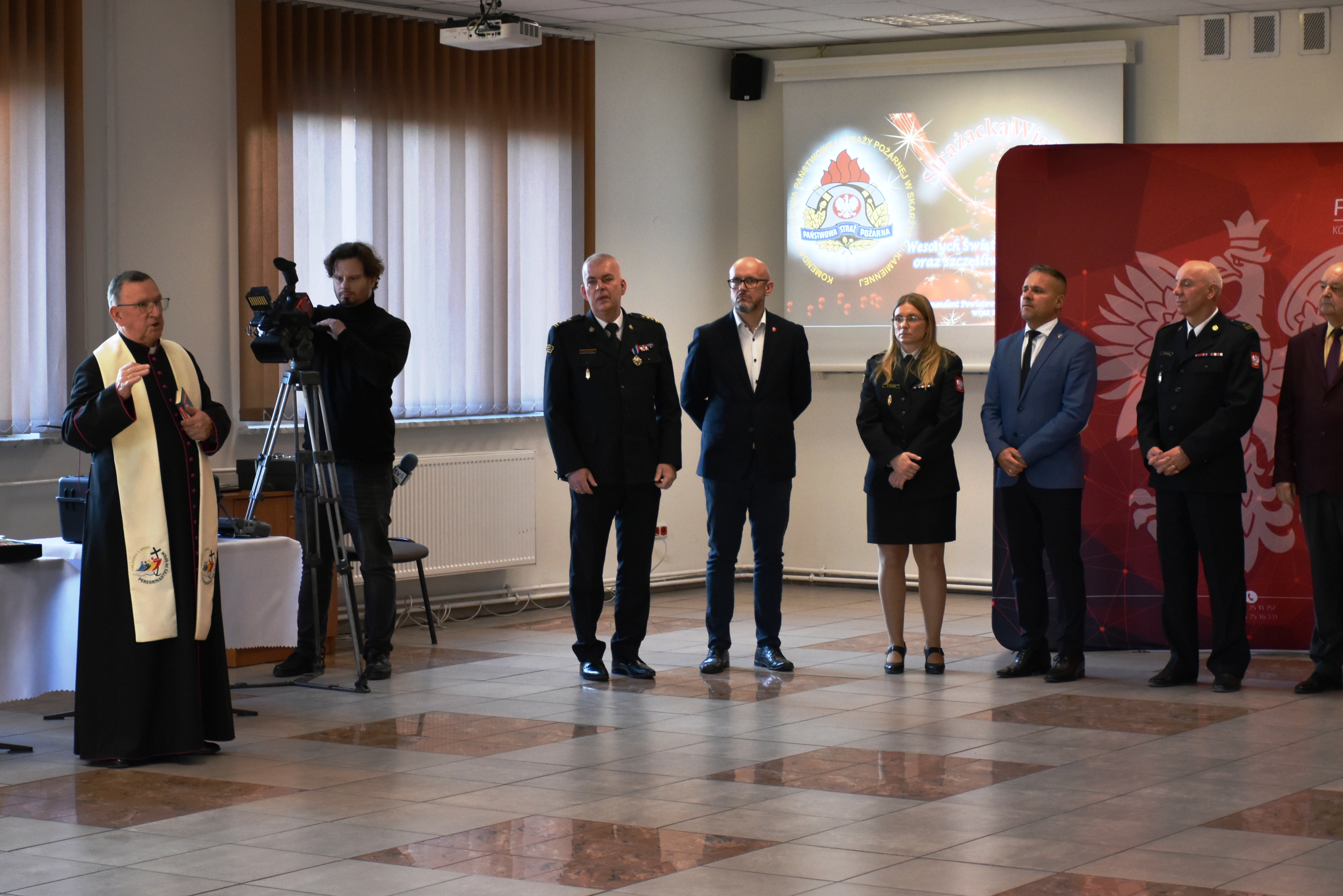 Po przywitaniu wszystkich uczestników spotkania przez Komendanta Powiatowego PSP w Skarżysku-Kamiennej mł. bryg. Sławomira Wawrzaka, obecny na uroczystym spotkaniu ks. prałat Jerzy Karbownik kapelan powiatowy strażaków z Sanktuarium Matki Bożej Ostrobramskiej odczytał fragment pisma świętego. Następnie wszyscy odśpiewali wspólnie kolędę.