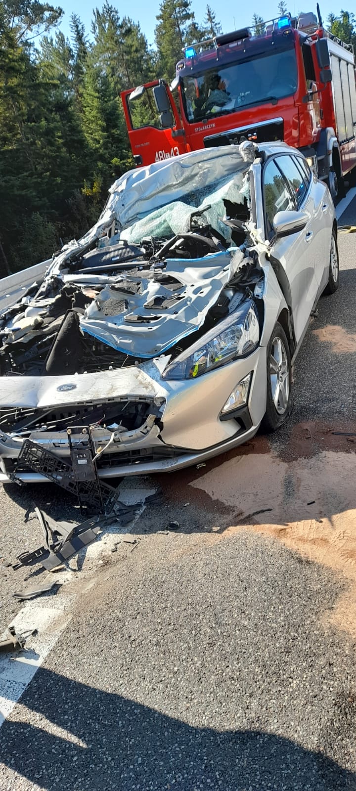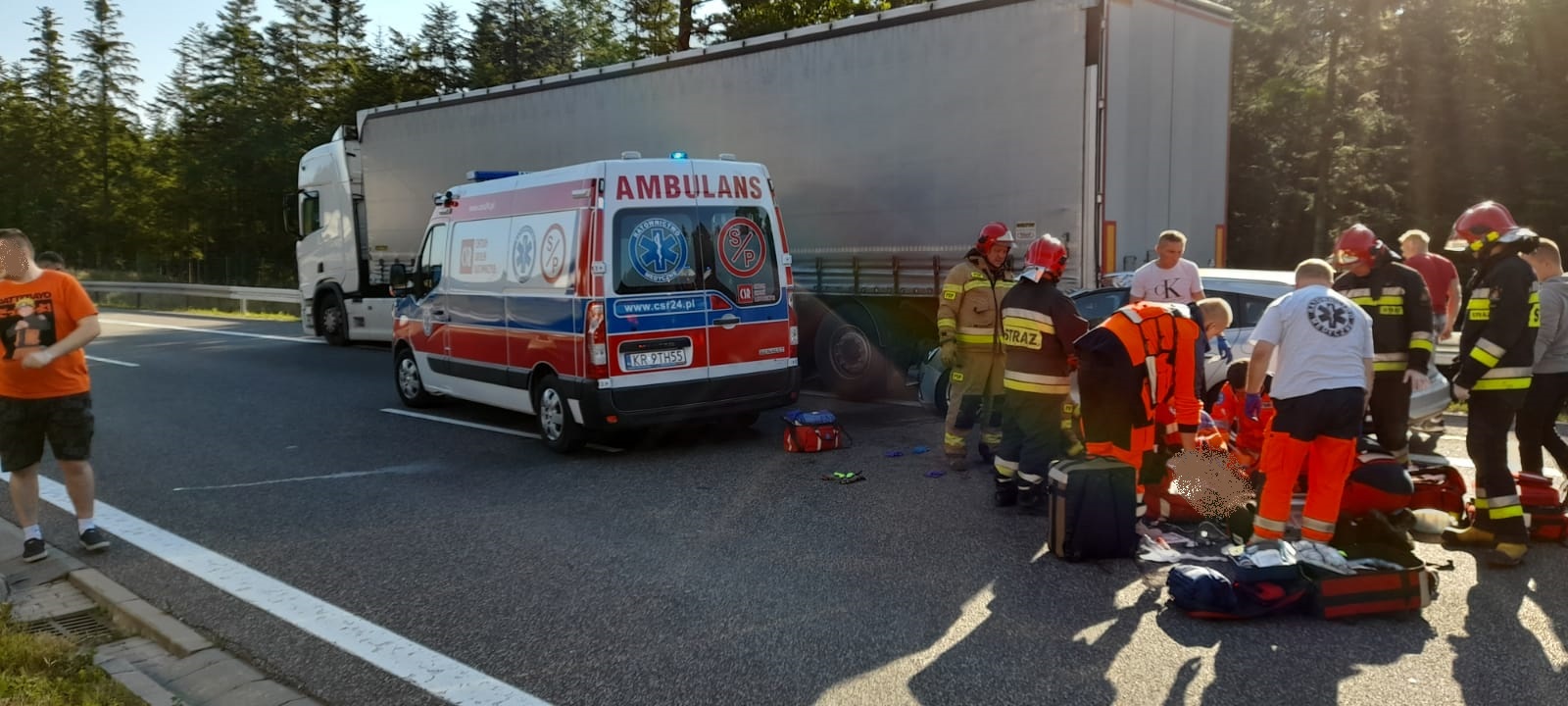 9 września br. o godz. 08:50 z Centrum Powiadamiania Ratunkowego w Kielcach wpłynęło zgłoszenie o wypadku na drodze ekspresowej S7 w Łącznej w kierunku Skarżyska-Kamiennej. Samochód osobowy, którym podróżował tylko kierowca uderzył w tył naczepy samochodu ciężarowego. Kierowca nie był w stanie opuścić pojazdu o własnych siłach. Dyżurny Stanowiska Kierowania Komendanta Powiatowego PSP w Skarżysku-Kamiennej, natychmiast zadysponował strażaków na miejsce zdarzenia. Na miejscu zdarzenia pierwsi byli strażacy z Komendy Powiatowej PSP w Skarżysku-Kamiennej jadący do Komendy Wojewódzkiej w Kielcach na trening przygotowujący do mistrzostw województwa w sporcie pożarniczym. Widząc zaistniałe zdarzenie na przeciwnym pasie ruchu, natychmiast zawrócili na pobliskim zjeździe do Łącznej i dojechali na miejsce zdarzenia. Działania strażaków polegały zabezpieczeniu miejsca zdarzenia oraz na udzieleniu kwalifikowanej pierwszej pomocy i prowadzeniu resuscytacji krążeniowo oddechowej. Ich natychmiastowa reakcja przyniosła efekt i czynności życiowe u kierowcy powróciły. Kilka minut później poszkodowany został przekazany Zespołowi Ratownictwa Medycznego. Działania przybyłych na miejsce zdarzenia zastępów z Jednostki Ratowniczo-Gaśniczej w Skarżysku-Kamiennej oraz Ochotniczej Straży Pożarnej w Suchedniowie polegały na neutralizacji i sorpcji wyciekłych płynów eksploatacyjnych oraz na pomocy pogotowiu przy udzielaniu pomocy medycznej poszkodowanemu w wypadku kierowcy, którego zabrał śmigłowiec Lotniczego Pogotowia Ratunkowego.