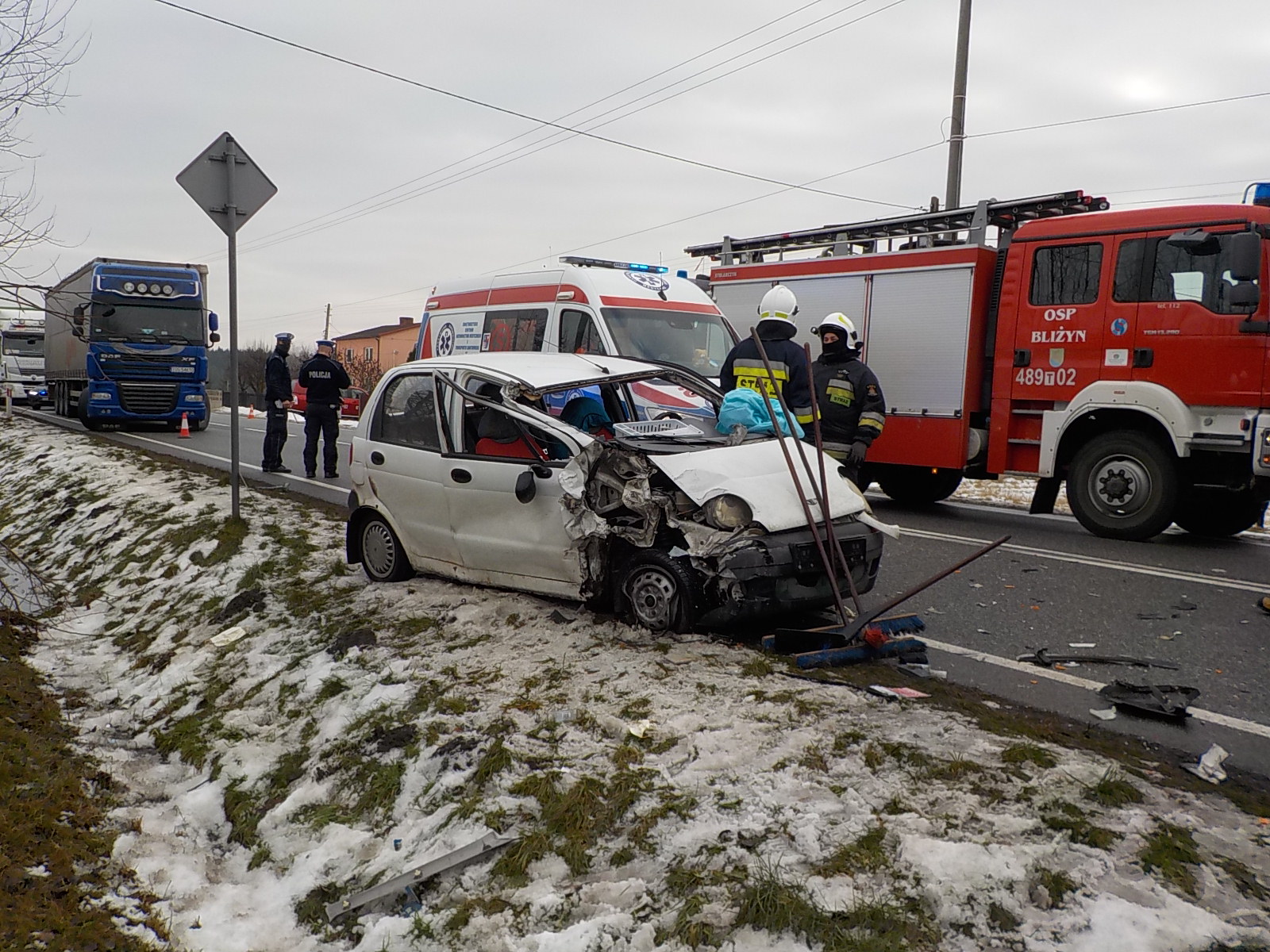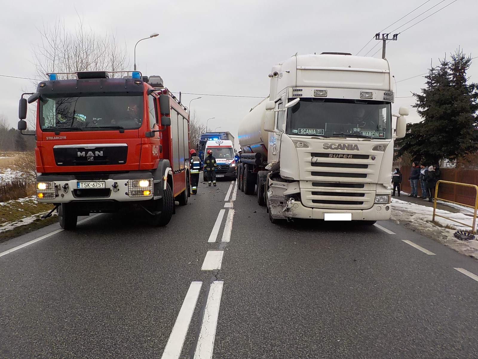 W dniu 3 lutego 2021 r. ok. godz. 13.10 z Centrum Powiadamiania Ratunkowego w Kielcach wpłynęło zgłoszenie o wypadku drogowym w miejscowości Górki gmina Bliżyn. Na miejsce zdarzenia zadysponowano dwa zastępy z JRG Skarżysko-Kamienna oraz jeden zastęp z jednostki OSP Bliżyn. Po dojeździe na miejsce zdarzenia stwierdzono, że na prostym odcinku drogi doszło do zderzenia samochodu osobowego marki Daewoo Matiz i ciężarowego marki Scania. W samochodzie osobowym przebywała jedna poszkodowana osoba (kierowca). Strażacy ewakuowali mężczyznę z pojazdu, otwierając drzwi od pasażera. Poszkodowany został przekazany obecnej na miejscu załodze Pogotowia Ratunkowego. Został on przewieziony do Szpitala w Skarżysku Kamiennej. Kierowca samochodu ciężarowego nie odniósł obrażeń i pozostał na miejscu zdarzenia. Obecni na miejscu wypadku funkcjonariusze Policji przeprowadzili czynności wyjaśniające, po czym samochody usunięto w bezpieczne miejsca.