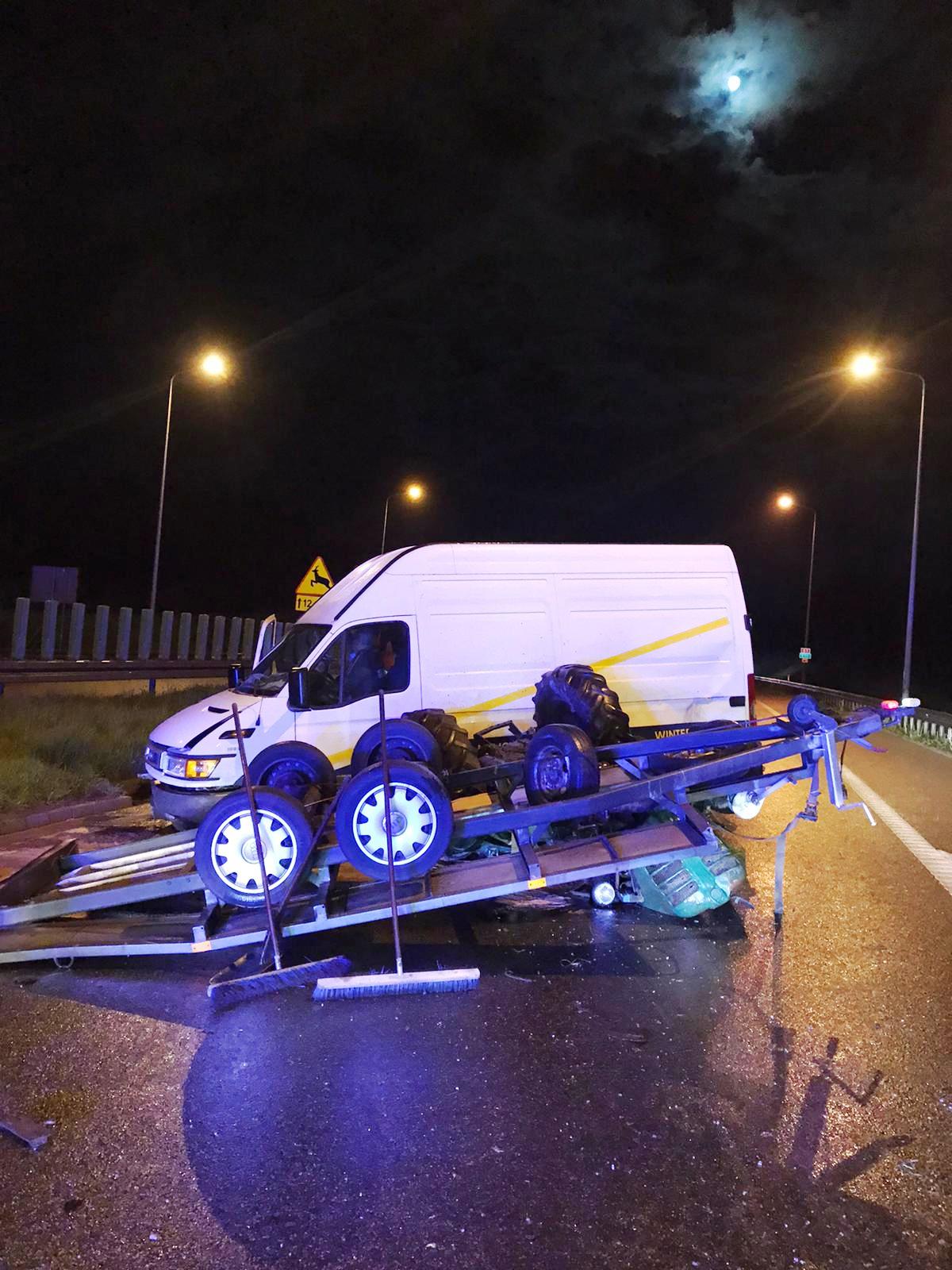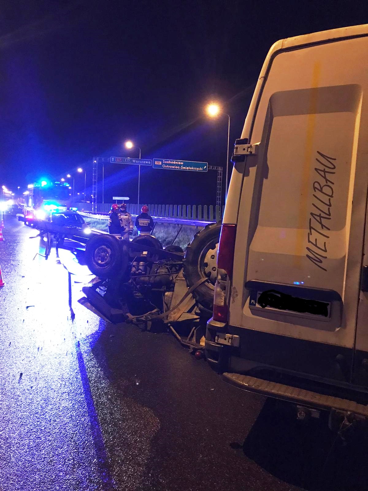 W dniu 23 maja br. o godzinie 22:26 wpłynęło zgłoszenie do Stanowiska Kierowania Komendanta Powiatowego PSP w Skarżysku-Kamiennej o zderzeniu samochodu osobowego BMW z Iveco Daily ciągnącego przyczepę typu laweta, na której znajdował się ciągnik rolniczy na trasie S7 w miejscowości Suchedniów. Przewrócona laweta z ciągnikiem tarasowały dwa pasy ruchu, przejazd był możliwy jedynie pasem awaryjnym. W wyniku kolizji uszkodzeniu uległy dwa pojazdy, przewożony na lawecie ciągnik rolniczy jak i bariera energochłonna. Pojazdami podróżowało sześć osób w tym dwójka dzieci, nikt nie odniósł żadnych obrażeń. Działania straży polegały na zabezpieczeniu miejsca zdarzenia, odłączeniu akumulatora w samochodzie Iveco i sorpcji rozlanych płynów eksploatacyjnych. Dalsze czynności wyjaśniające przyczynę powstania wypadku prowadzi KPP Policji w Skarżysku-Kamiennej.