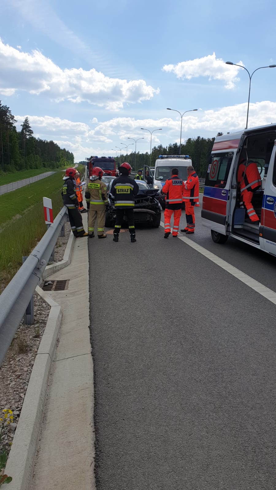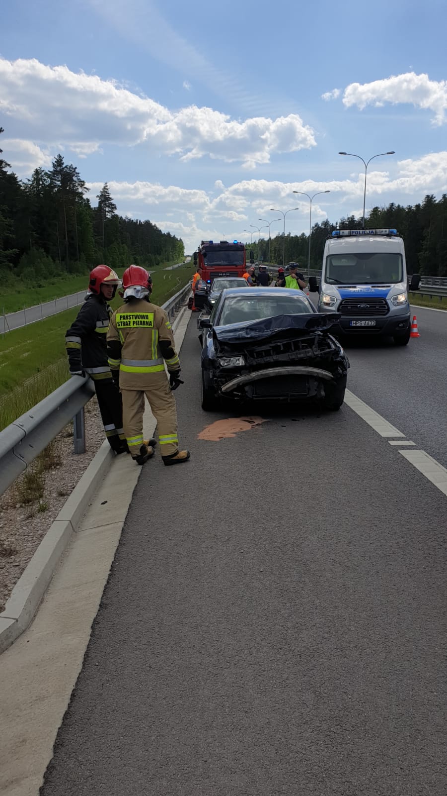 3 czerwca br. o godzinie 14:44 do stanowiska kierowania komendanta powiatowego PSP w Skarżysku-Kamiennej wpłynęło zgłoszenie o zderzeniu samochodu osobowego ciągnącego przyczepę typu laweta z barierami energochłonnymi na trasie S7 w kierunku Warszawy. Działania zastępów z JRG Skarżysko-Kamienna polegały na zabezpieczeniu terenu akcji, odłączeniu napięcia w pojeździe, neutralizacji wyciekłych płynów eksploatacyjnych z pojazdu za pomocą sorbentu oraz udzieleniu kwalifikowanej pierwszej pomocy kierowcy pojazdu Volkswagen. Po przebadaniu przez zespół ratownictwa medycznego kierowca został zabrany na dalsze badania do szpitala.