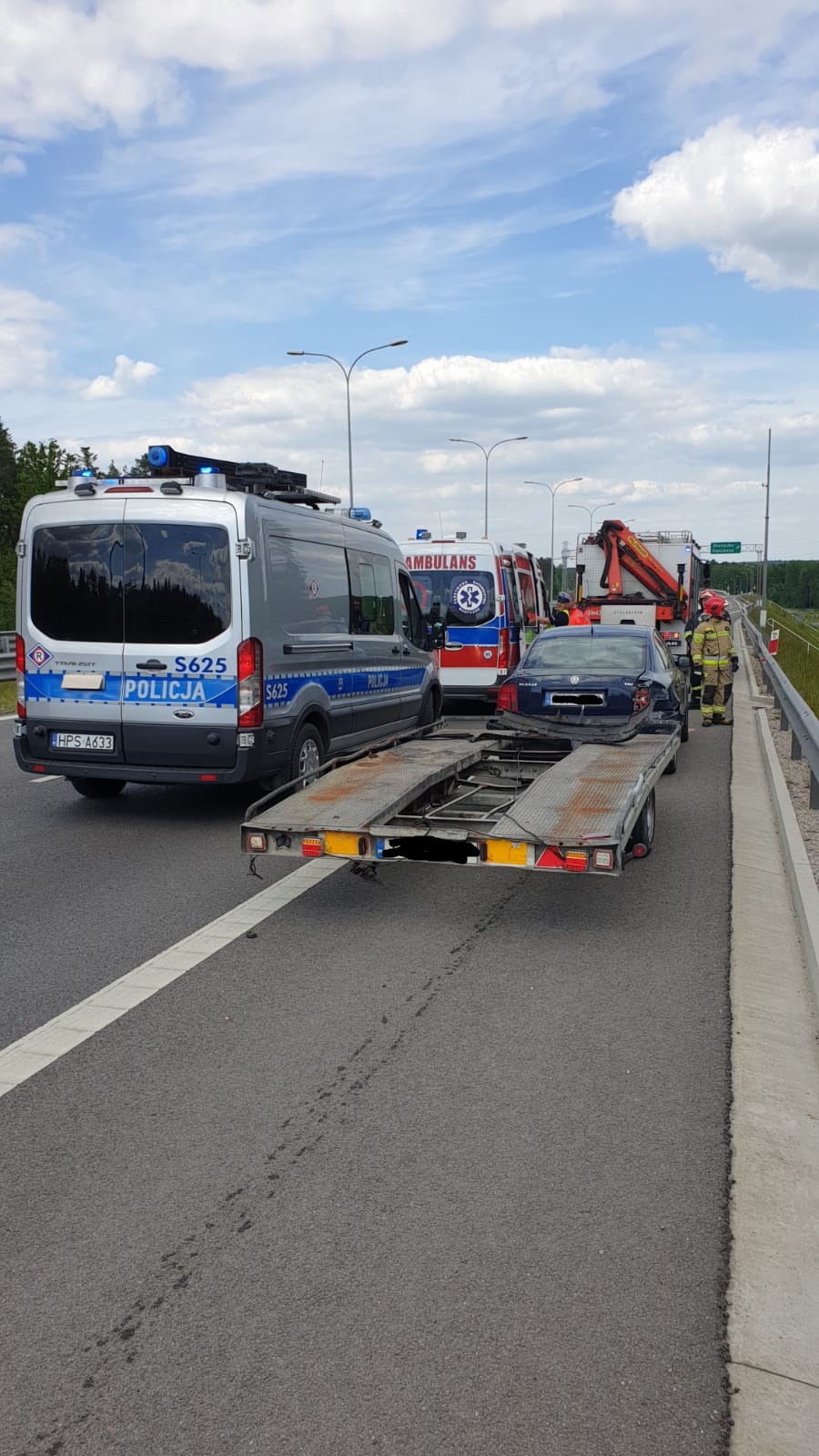 Zderzenie Volkswagena ciągnącego przyczepę typu laweta z barierami energochłonnymi na trasie S7 w Skarżysku-Kamiennej