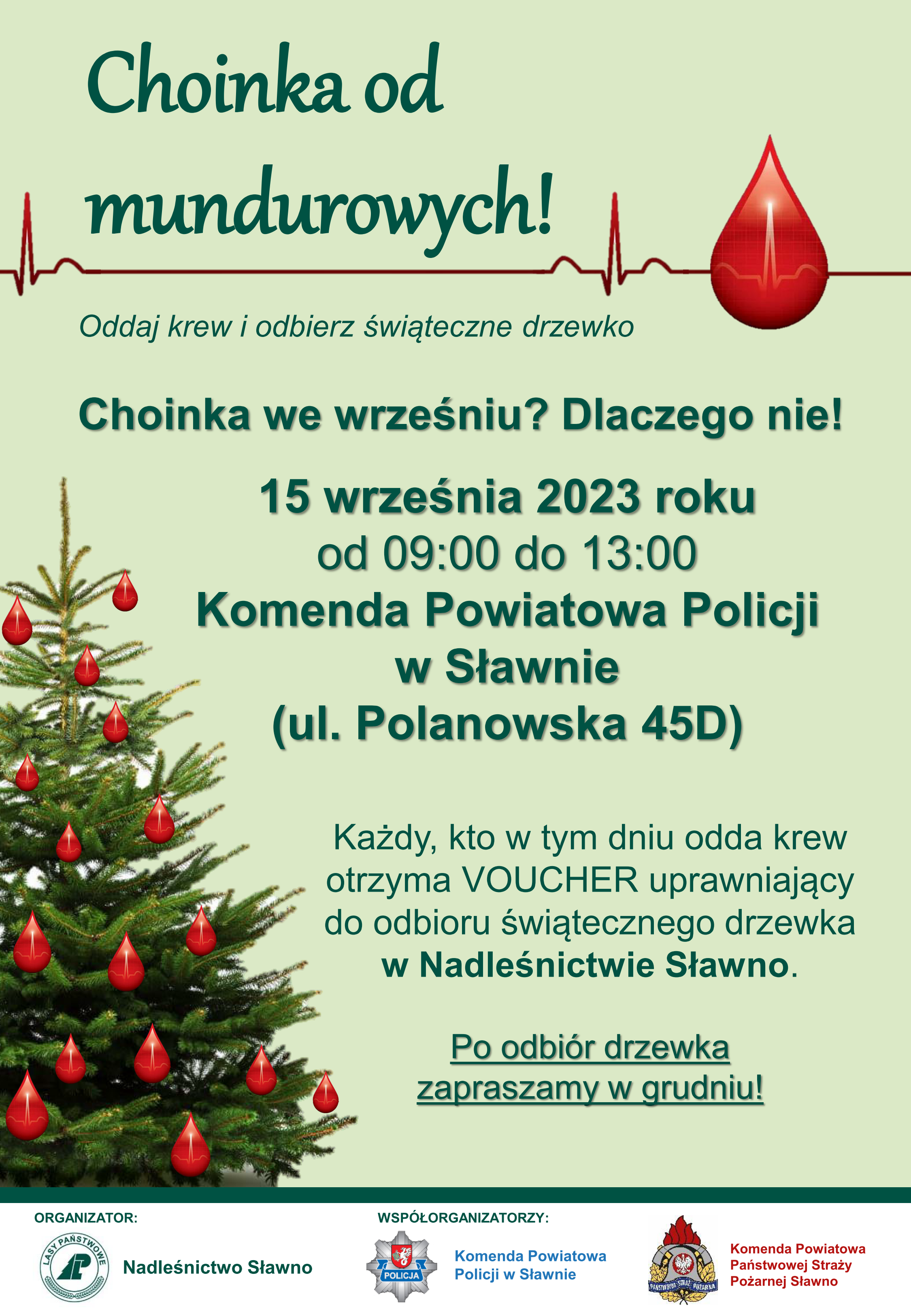 Nadleśnictwo Sławno wraz z Komendą Powiatową Policji oraz Komendą Powiatową Państwowej Straży Pożarnej w Sławnie zaprasza do udziału w akcji „Choinka od mundurowych”, która odbędzie się u nas wyjątkowo 15 września 2023 roku. Każdy, kto w tym dniu odda krew otrzyma VOUCHER uprawniający do odbioru świątecznego drzewka w Nadleśnictwie Sławno. Po odbiór drzewka zapraszamy do naszego biura w grudniu!