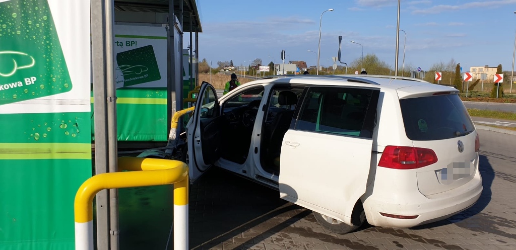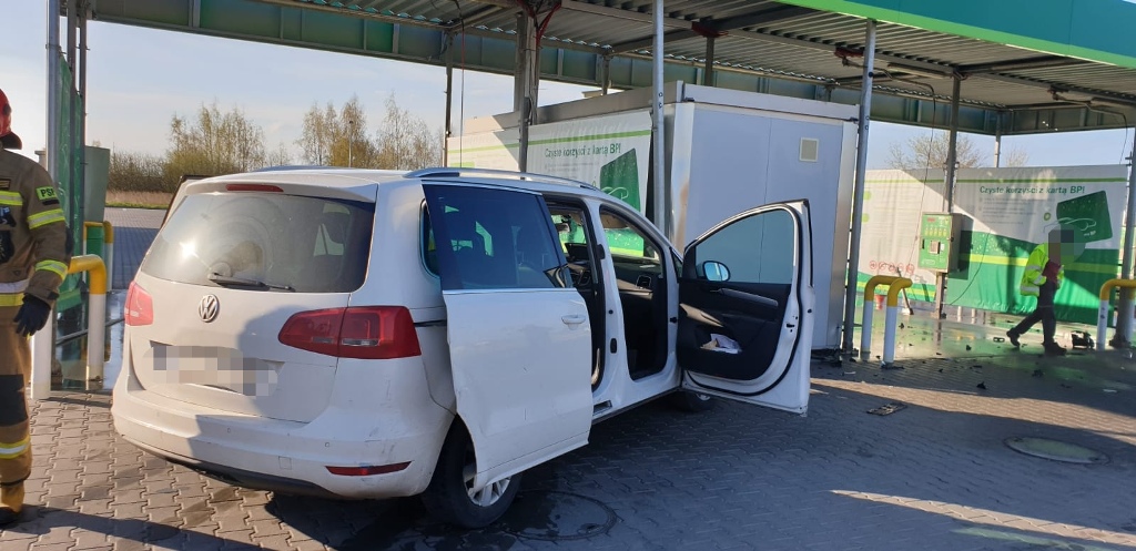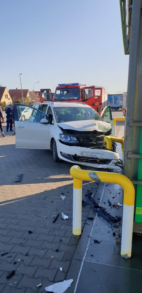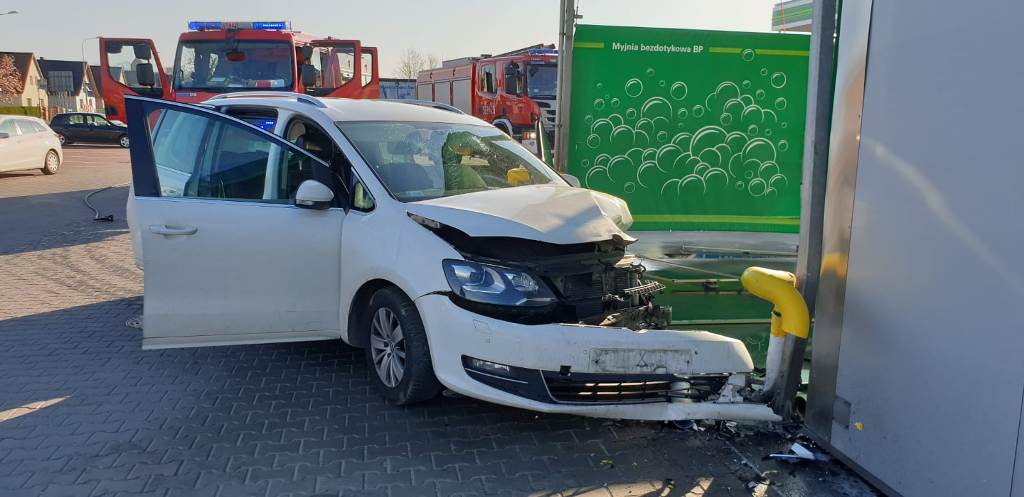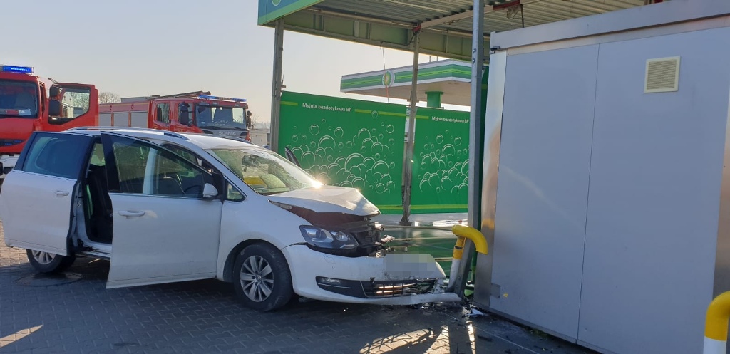 Z chwilą przybycia na miejsce zdarzenia pierwszych zastępów stwierdzono uderzenie samochodu osobowego marki Volkswagen Sharan w barierki zabezpieczające myjnię samochodową znajdującą się przy stacji paliw BP. Zabezpieczono miejsce zdarzenia. Pojazdem podróżowały trzy osoby, którym strażacy udzielili kwalifikowanej pierwszej pomocy medycznej, następnie osoby poszkodowane zostały przekazane przybyłym na miejsce zdarzenia Zespołom Ratownictwa Medycznego.