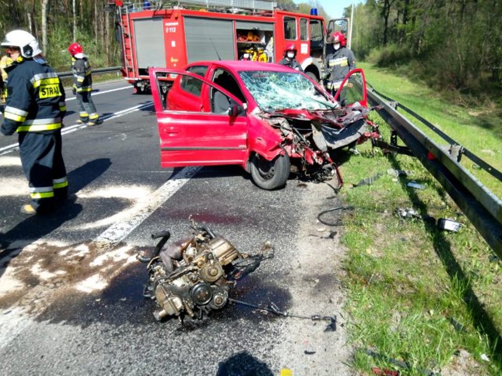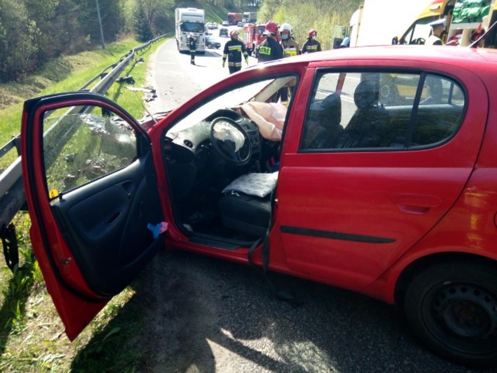 Z chwilą przybycia na miejsce zdarzenia pierwszych zastępów stwierdzono zderzenie czołowe samochodu osobowego marki Toyota Yaris z samochodem ciężarowym. Zabezpieczono miejsce zdarzenia. W zdarzeniu brały udział dwie osoby kierujące pojazdami, które przed przybyciem zastępów same opuściły pojazdy. Osoby biorące udział w wypadku zostały przebadane przez Zespół Ratownictwa Medycznego przybyłego na miejsce zdarzenia. Po przebadaniu kierująca samochodem osobowym została przetransportowana przez ZRM do szpitala.