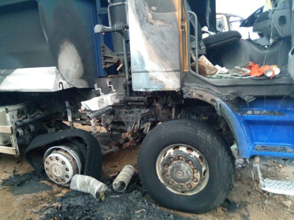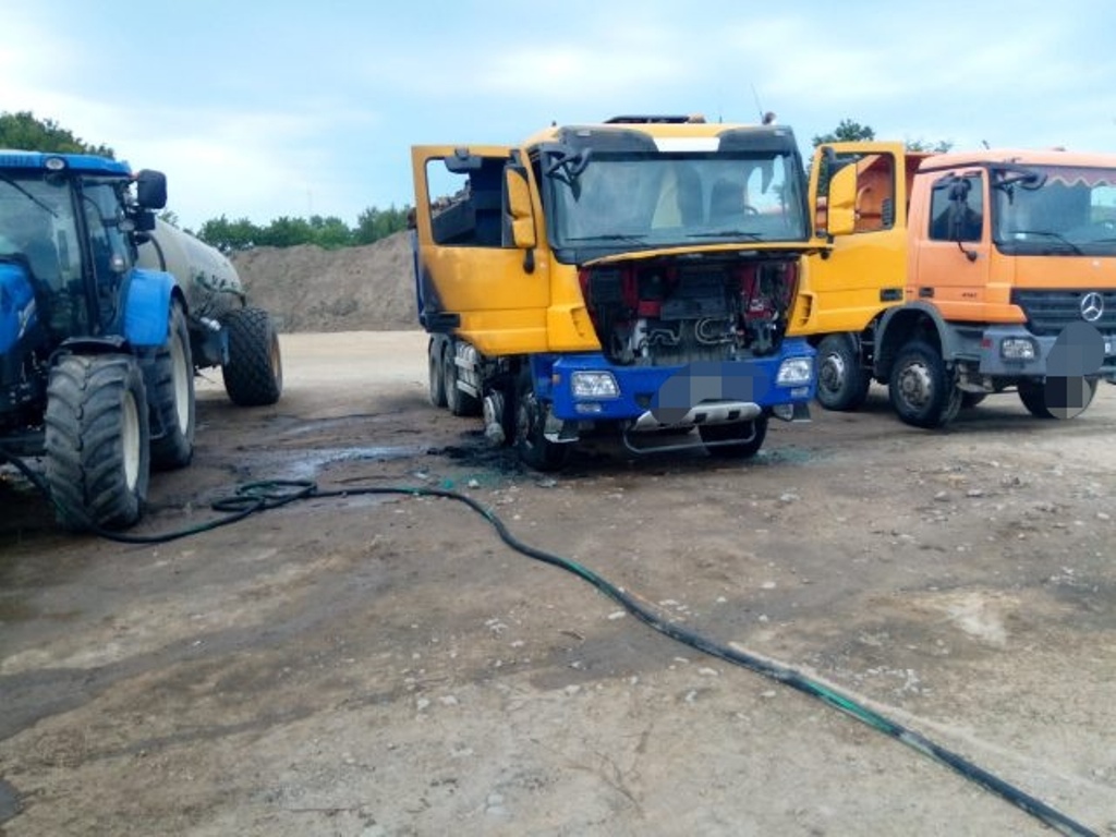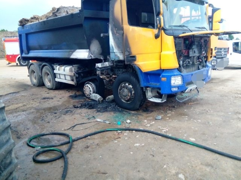 Z chwilą przybycia na miejsce zdarzenia pierwszych zastępów stwierdzono pożar samochodu ciężarowego Mercedes Actros znajdującego się na placu budowy. Zabezpieczono miejsce zdarzenia. Pożarem objęty był bok pojazdu wraz z kabiną, strażacy podali środek gaśniczy w natarciu na palące się auto po czym pożar ugaszono. W wyniku pożaru spaleniu uległ częściowo bok pojazdu oraz kabina. Brak osób poszkodowanych.
