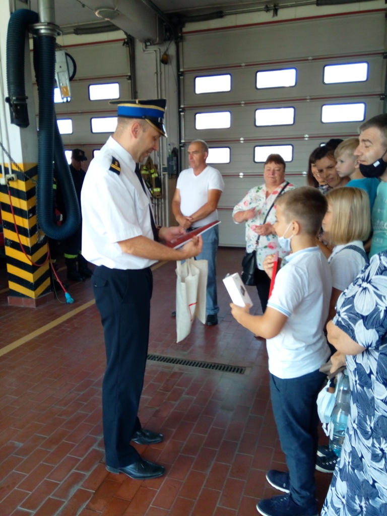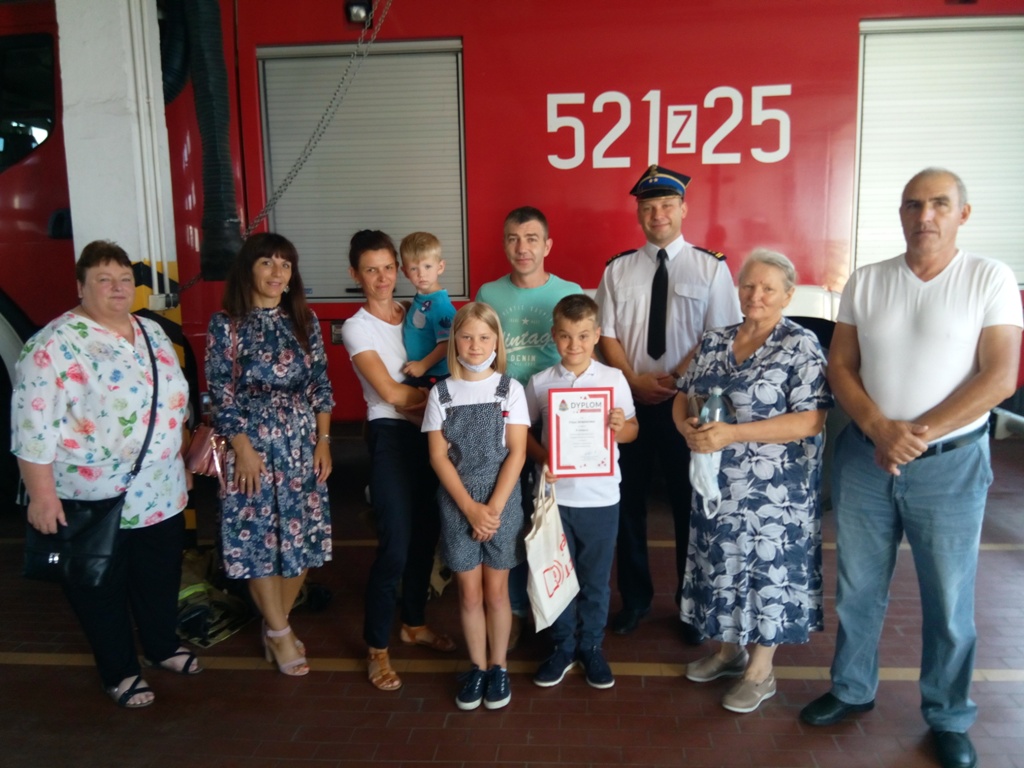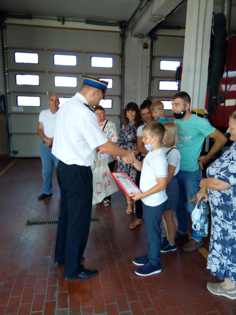 W dniu 05.07.2021r. w Komendzie Powiatowej Państwowej Straży Pożarnej w Sławnie odbyło się uroczyste wręczenie nagród za zajęcie drugiego miejsca w konkursie kalendarzowym organizowanym przez KGPSP w kategorii gra planszowa. Laureatem z powiatu sławieńskiego jest Filip Semanow ze Szkoły Podstawowej im. Gen. S. Roweckiego- Grota w Żukowie. Nagrody oraz dyplom Komendanta Głównego PSP wręczył Komendant Powiatowy Państwowej Straży Pożarnej w Sławnie bryg. Paweł Faryno. Wyróżnienie odbyło się w obecności rodziny laureata oraz dyrektora szkoły. Po części oficjalnej zaproszeni goście mieli okazję zwiedzić Jednostkę Ratowniczo Gaśniczą w Sławnie i obejrzeć będące na jej wyposażeniu samochody bojowe.