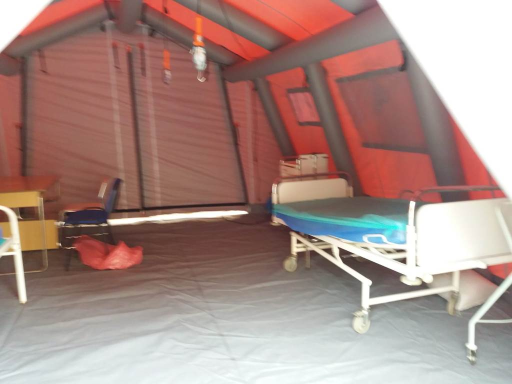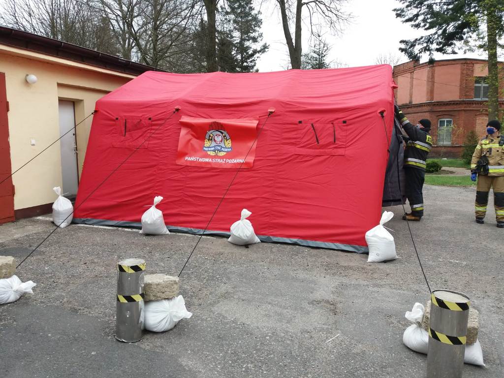 - strażacy z Jednostki Ratowniczo-Gaśniczej w Sławnie na bieżąco monitorują namiot pneumatyczny pełniący funkcję polowej izby przyjęć, który rozstawiony jest przy Szpitalu Powiatowym w Sławnie.