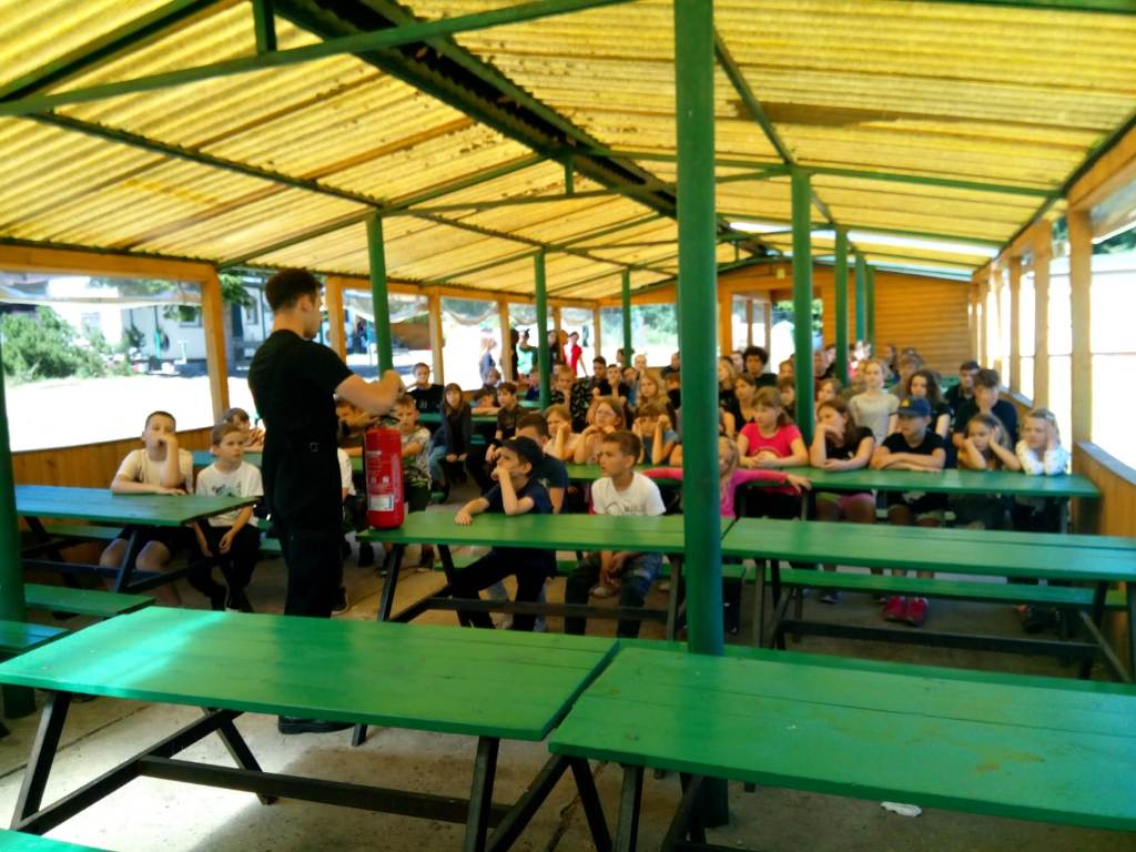 Podczas spotkań zostały przeprowadzone zajęcia edukacyjne obejmujące sposób postępowania podczas zagrożeń mogących wystąpić na terenie obozu – ze szczególnym uwzględnieniem pożarów, gwałtownych wyładowań atmosferycznych i opadów deszczu oraz wichur. Strażacy prowadzili pogadanki dotyczące pierwszej pomocy przedmedycznej i sposób informowania służb o zdarzeniach.