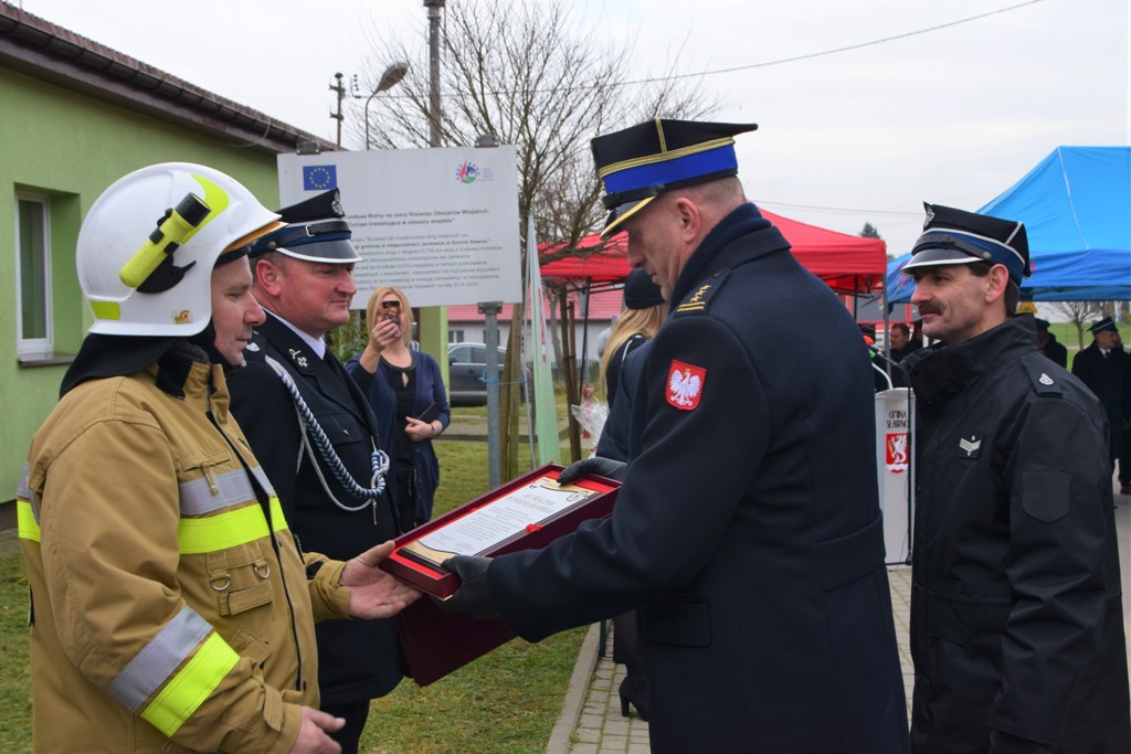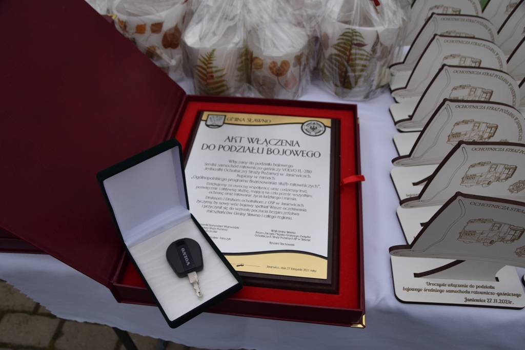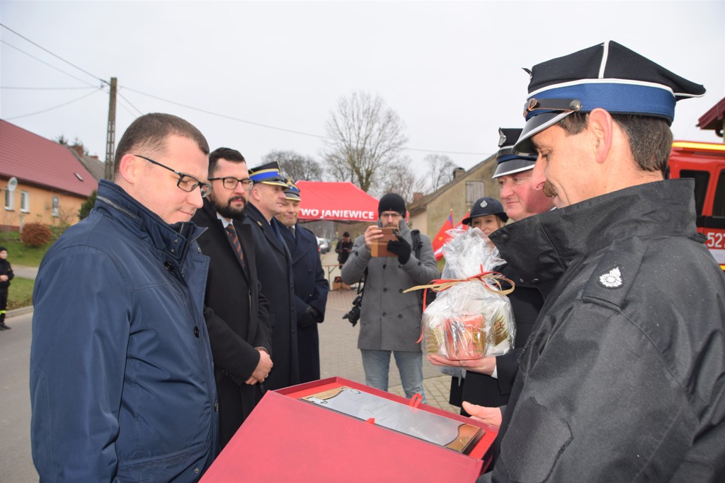 Następnie odbyło się uroczyste włączenie pojazdu do podziału bojowego poprzez wręczenie kluczyków do nowego wozu oraz symbolicznego Aktu Włączenia. Z rąk Pawła Szefernakera – Sekretarza Stanu MSWiA, Jarosława Tomczyka – Zachodniopomorskiego Komendanta Wojewódzkiego PSP i Wójta gminy Sławno kluczyki i akt włączenia odebrali przedstawiciele OSP w Janiewicach: Artur Krzemieniec – prezes i Dariusz Tulula – Naczelnik.