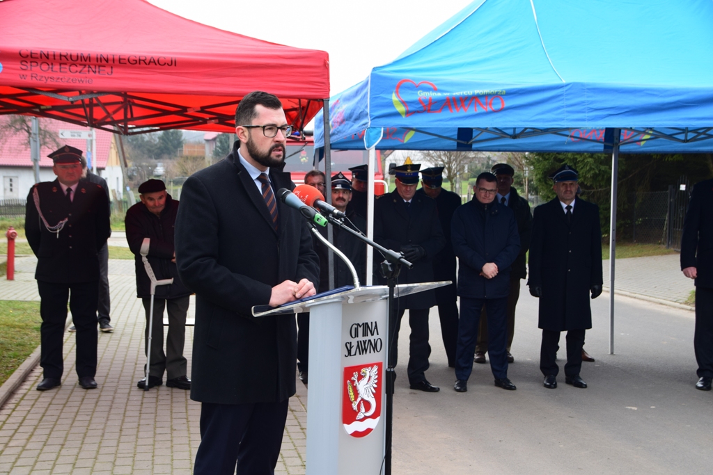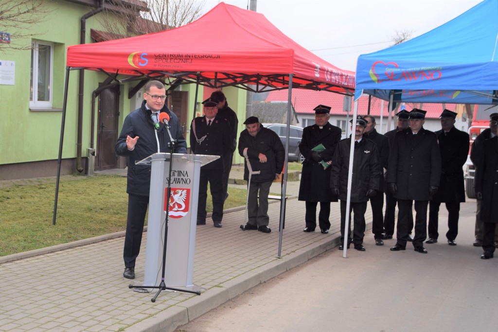 Wójt Gminy Sławno, Prezes Zarządu Miejsko-Gminnego Związku OSP RP w Sławnie Ryszard Stachowiak wraz z Arturem Krzemieńcem – Prezesem OSP w Janiewicach oficjalnie powitali wszystkich przybyłych na uroczystość gości.