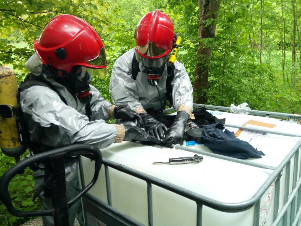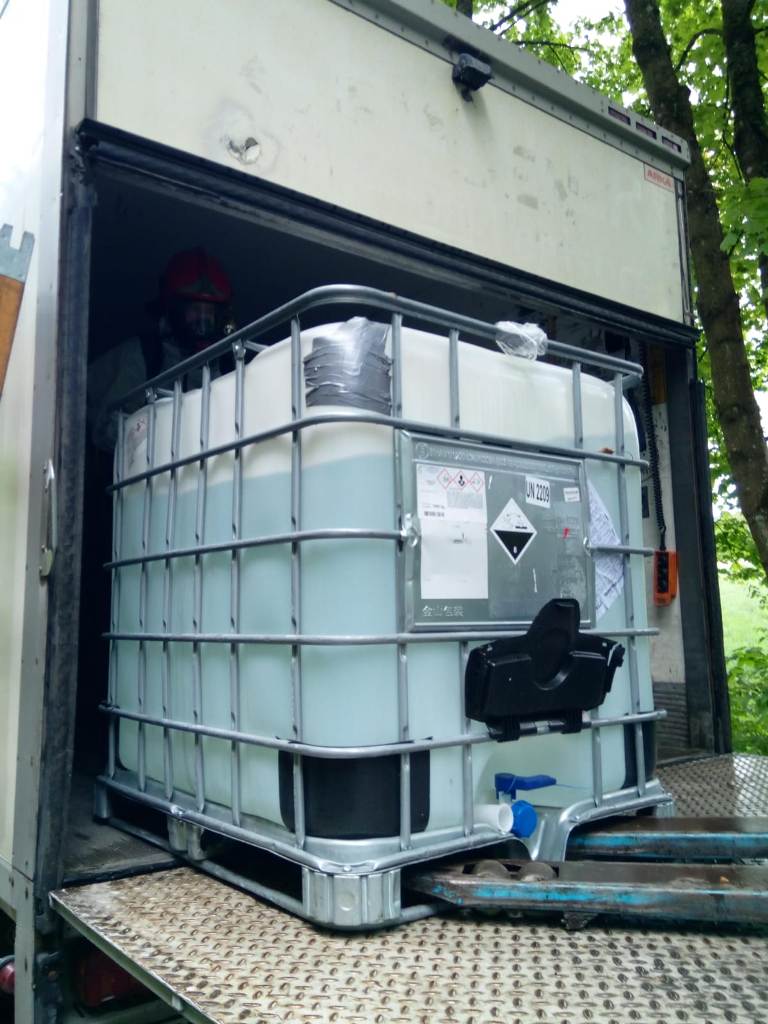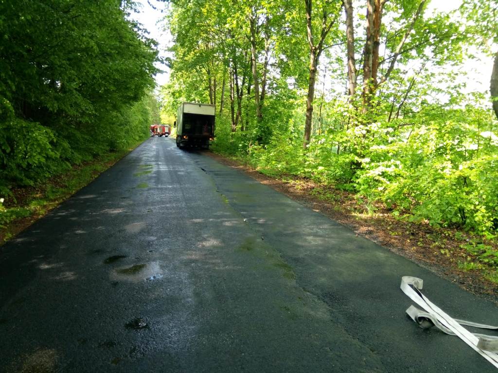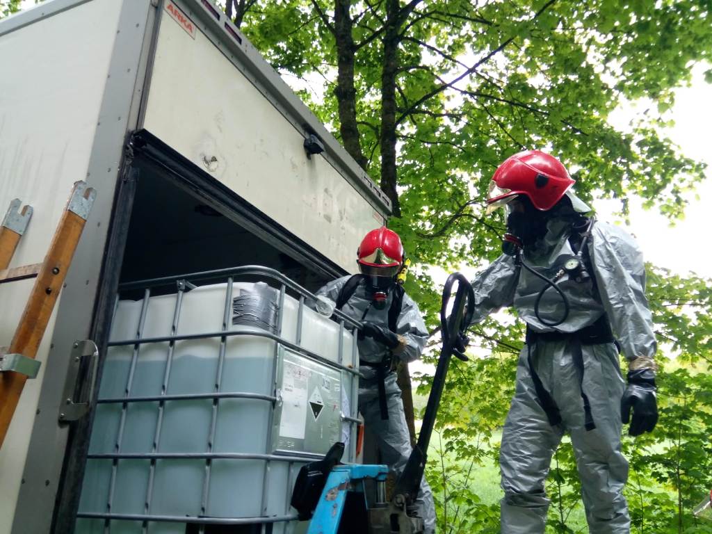 Z chwilą przybycia na miejsce zdarzenia pierwszych zastępów stwierdzono samochód ciężarowy marki VOLVO stojący na poboczu drogi. Pojazdem transportowana była substancja chemiczna w zbiorniku, który uległ rozszczelnieniu. Strażacy zabezpieczyli miejsce zdarzenia, została zamknięta komunikacja w ruchu lądowym na czas prowadzenia działań. Na miejsce zdarzenia zadysponowano specjalistyczną grupę ratownictwa chemiczno-ekologicznego z JRG 2 Koszalin.