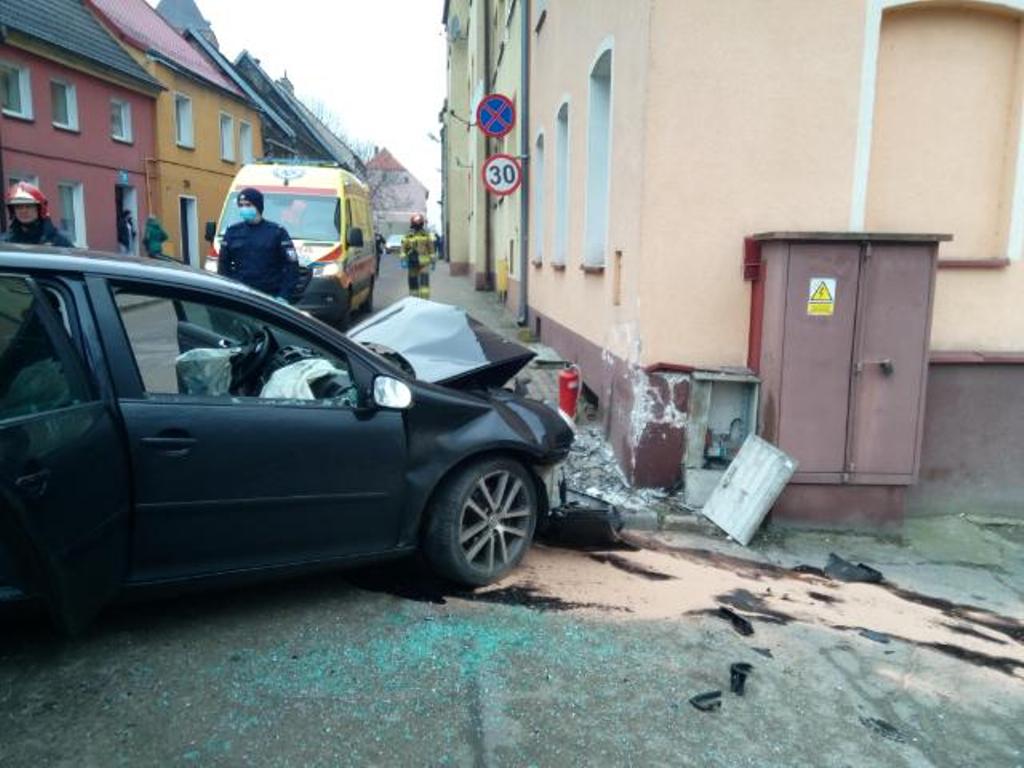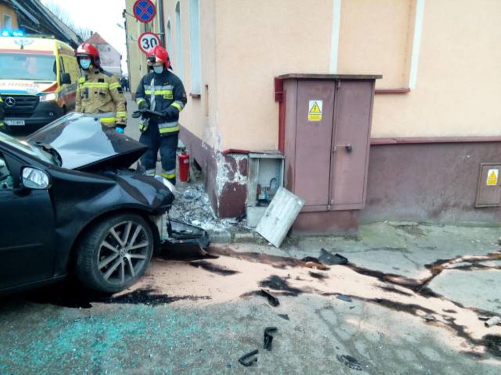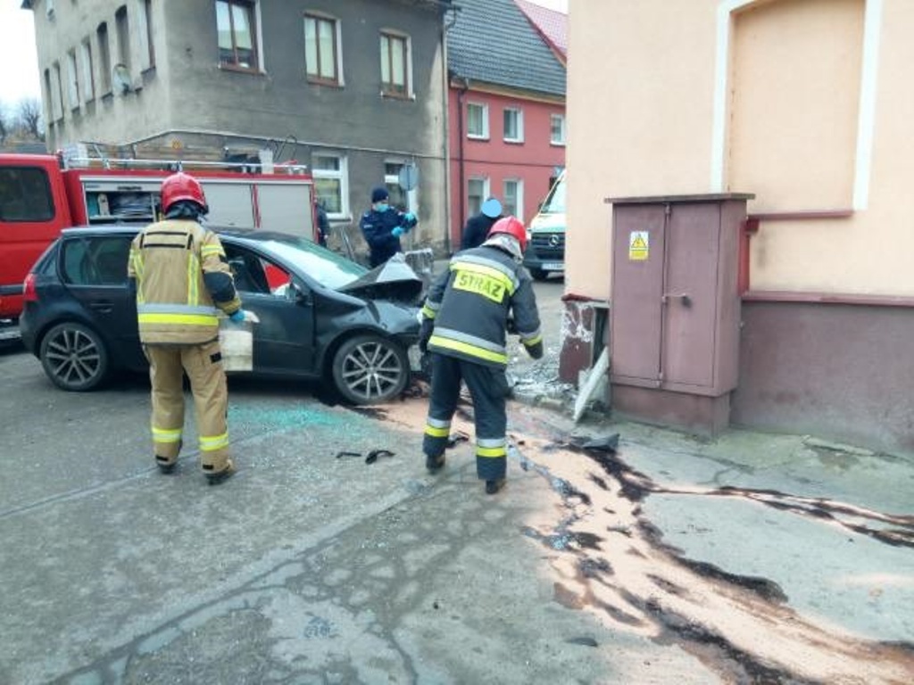Z chwilą przybycia na miejsce zdarzenia pierwszych zastępów stwierdzono wypadek samochodu osobowego, który uderzył w ścianę budynku mieszkalnego. Strażacy zabezpieczyli miejsce zdarzenia. Pojazdem podróżowały dwie osoby, mężczyzna lat 28 i kobieta lat 24. Poszkodowanym została udzielona kwalifikowana pierwsza pomoc, następnie osoby zostały przekazane Zespołowi Ratownictwa Medycznego. Po przebadaniu poszkodowani z ogólnymi obrażeniami zostali przetransportowani przez ZRM do szpitala.