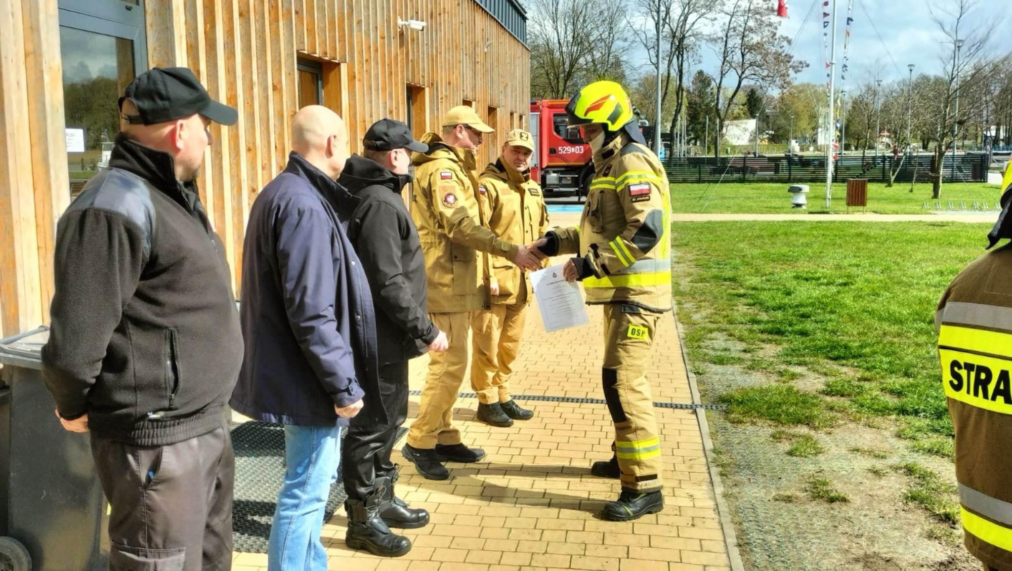 p.o. Komendanta Powiatowego Państwowej Straży Pożarnej w Sławnie bryg. Maciej Wojciechowski wspólnie z Panem Radosławem Głażewskim Wójtem Gminy Darłowo pogratulowali i wręczyli zaświadczenia ukończenia szkolenia.