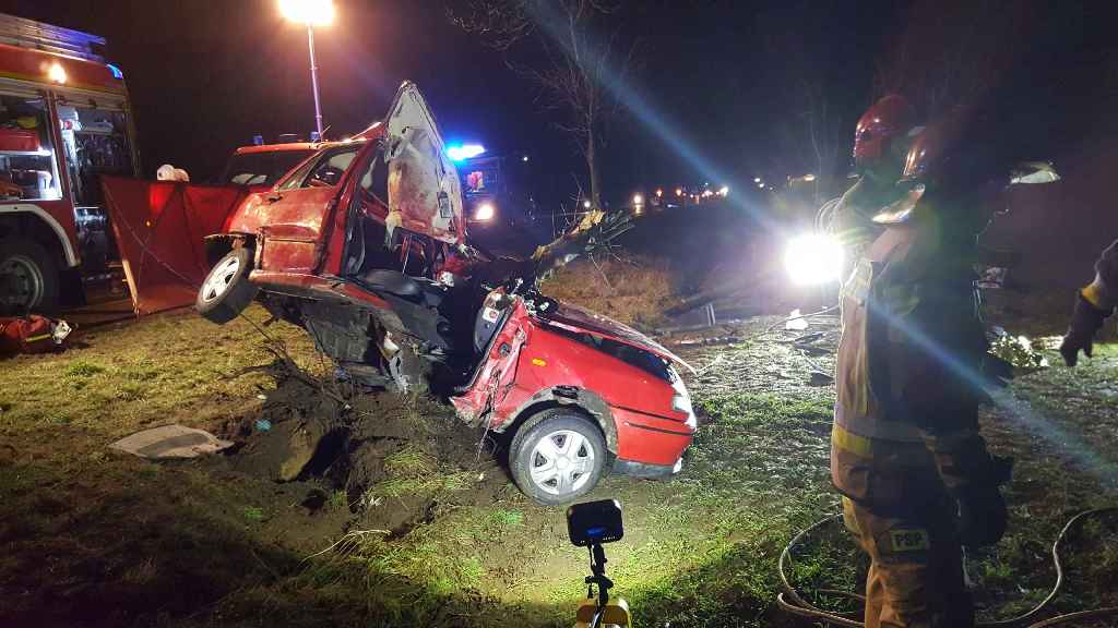 Z chwilą przybycia na miejsce zdarzenia pierwszych zastępów straży pożarnej stwierdzono uderzenie samochodu osobowego w przydrożne drzewo . Pojazdem podróżowały 3 osoby, w wyniku wypadku 1 osoba zginęła ( kobieta) natomiast dwie pozostałe osoby poszkodowane z ciężkimi obrażeniami zostały przetransportowane przez ZRM do szpitala.