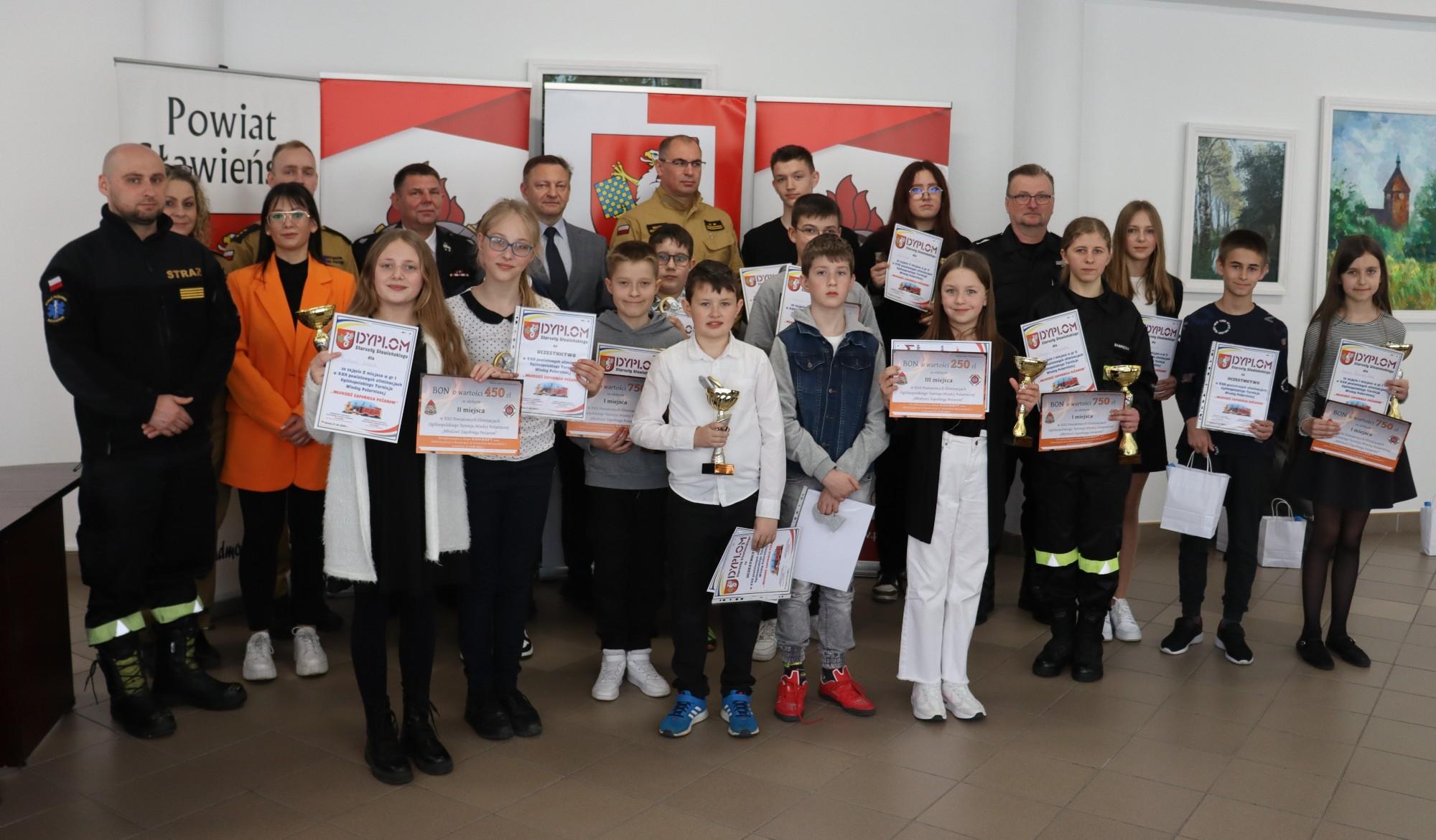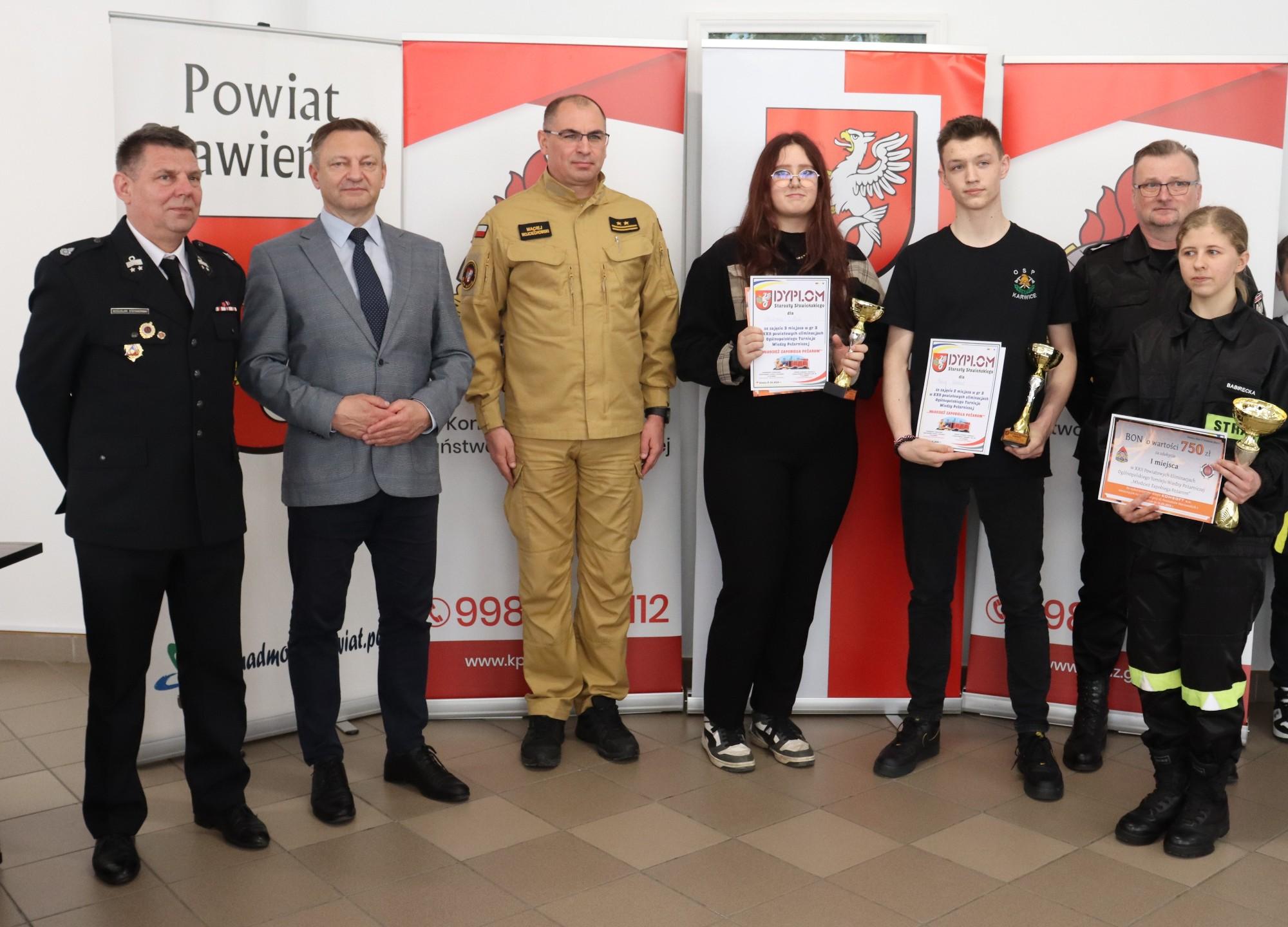 Starosta Sławieński Pan Wojciech Wiśniowski wraz z p.o. Komendanta Powiatowego PSP w Sławnie Panem bryg. Maciejem Wojciechowskim wręczył nagrody i puchary oraz pogratulował wszystkim uczestnikom. Jednocześnie złożył wyrazy uznania dla dzieci