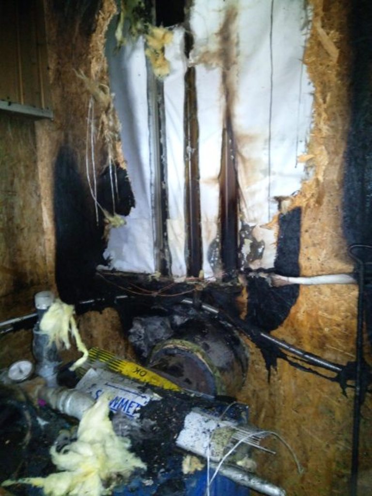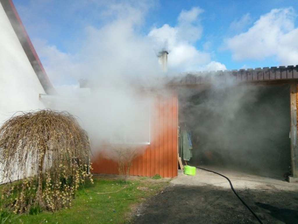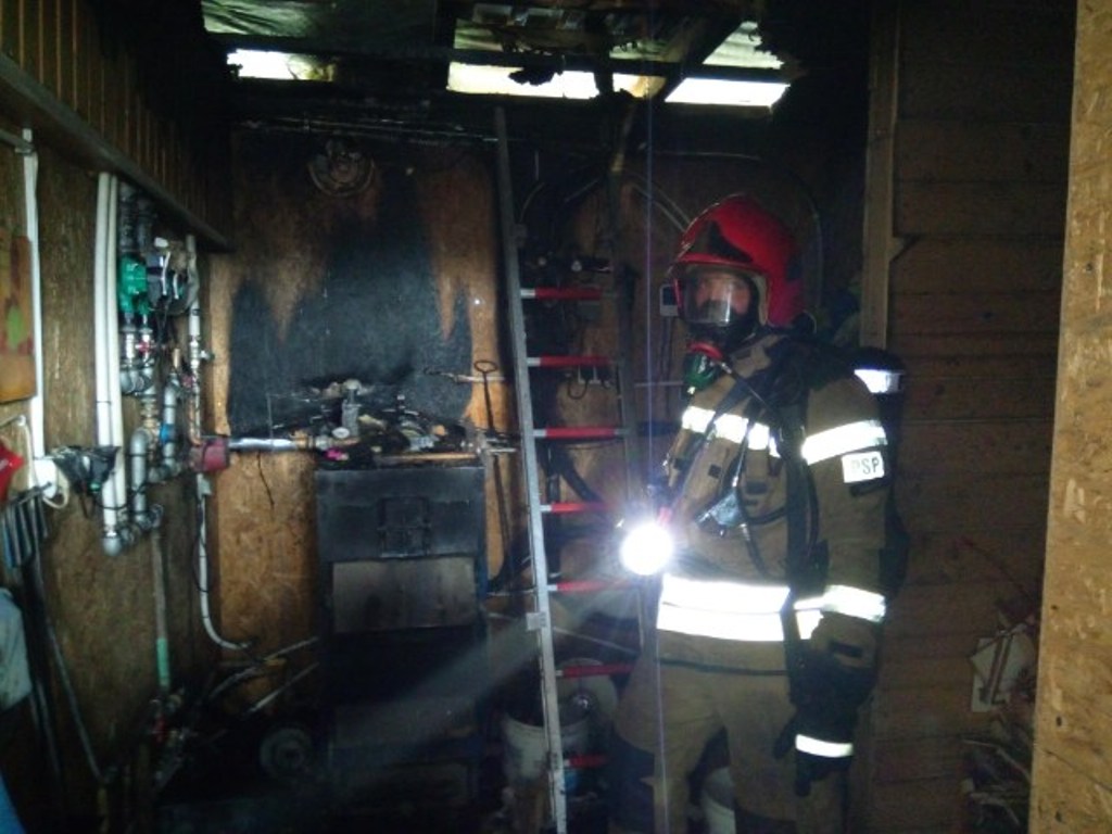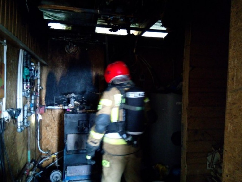 Z chwilą przybycia na miejsce zdarzenia pierwszych zastępów straży pożarnej stwierdzono wydobywający się dym z budynku w którym znajdowała się kotłownia. Zabezpieczono miejsce zdarzenia. Strażacy w aparatach ochrony układu oddechowego podali prądy wody w natarciu na palące się elementy konstrukcyjne budynku czym pożar został ugaszony. Spaleniu uległa część elementów konstrukcyji drewnianej oraz instalacja C.O. kotłowni. Właściciel oszacował straty na ok. 15tyś. zł.