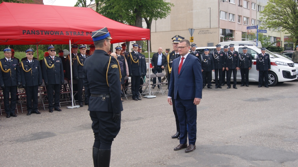 Jednym z punktów ceremoniału było złożenie przez dowódcę uroczystości st. kpt. Michała Smelę meldunku Sekretarzowi Stanu w Ministerstwie Spraw Wewnętrznych i Administracji Panu Pawłowi Szefernakerowi. Pan Minister w asyście Zastępcy Komendanta Głównego Państwowej Straży Pożarnej nadbryg. Krzysztofa Hejduka dokonał przeglądu pododdziałów, następnie uroczyście podniesiono flagę państwową na maszt oraz został odegrany Hymn Państwowy przez Orkiestrę Dętą Ziemi Sławieńskiej.