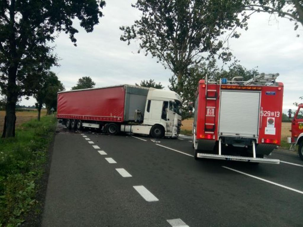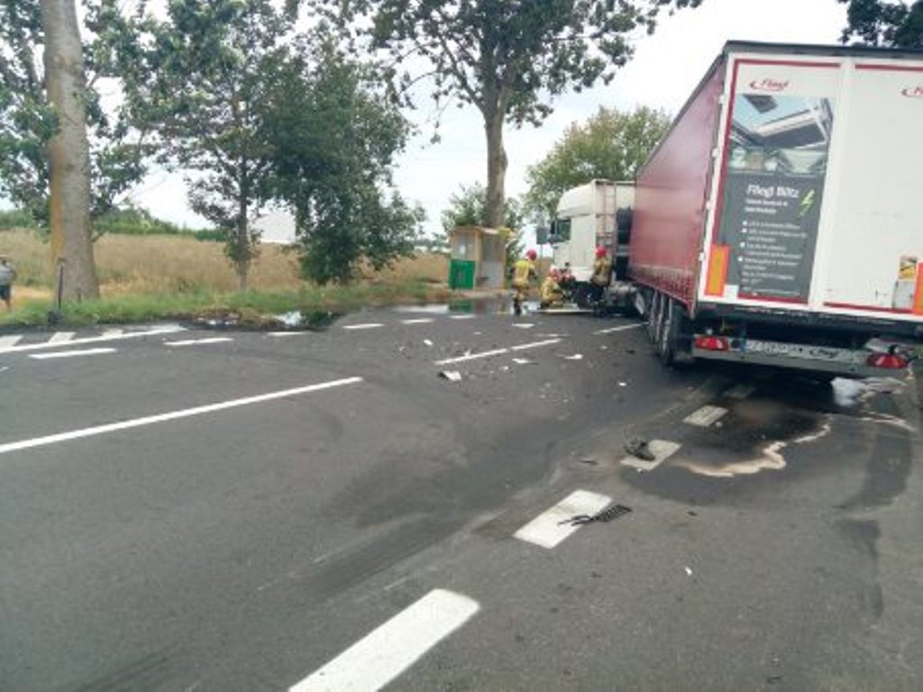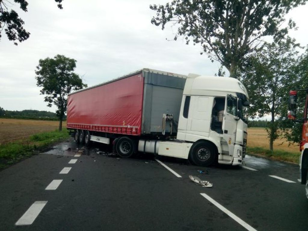 Z chwilą przybycia na miejsce zdarzenia pierwszych zastępów stwierdzono zderzenie samochodu ciężarowego z samochodem osobowym. Zabezpieczono miejsce zdarzenia. Strażacy udzielili kwalifikowanej pierwszej pomocy osobie poszkodowanej z samochodu osobowego. Po przybyciu na miejsce zdarzenia Zespołu Ratownictwa Medycznego, osoba poszkodowana została przekazana. Po przebadaniu przez ZRM poszkodowany został przetransportowany przez Lotnicze Pogotowie Ratunkowe do szpitala.
