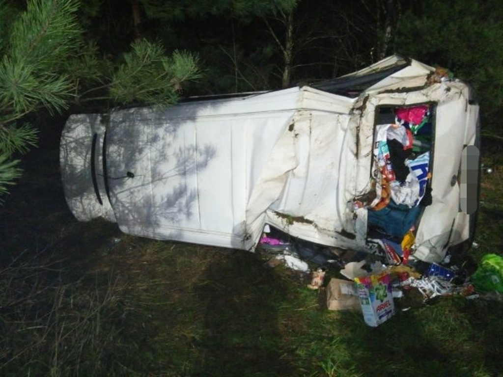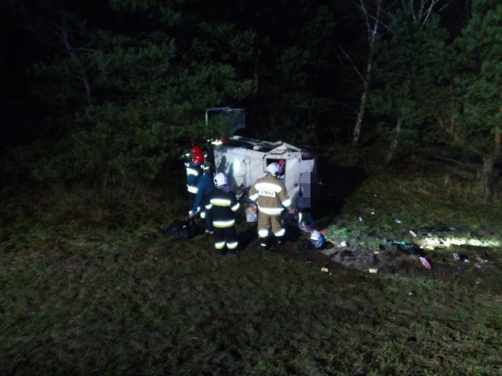 Z chwilą przybycia na miejsce zdarzenia pierwszych zastępów stwierdzono samochód dostawczy po dachowaniu znajdujący się poza pasem ruchu drogowego. Zabezpieczono miejsce zdarzenia. Pojazdem podróżowały dwie osoby, którym strażacy udzielili kwalifikowanej pierwszej pomocy. Osoby poszkodowane zostały przekazane Zespołowi Ratownictwa Medycznego przybyłemu na miejsce zdarzenia. Po przebadaniu przez ZRM nie było potrzeby hospitalizacji osób .